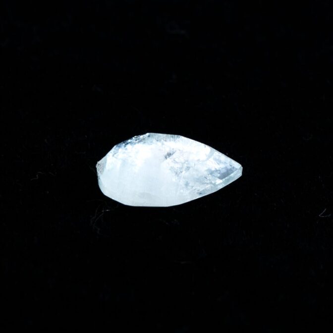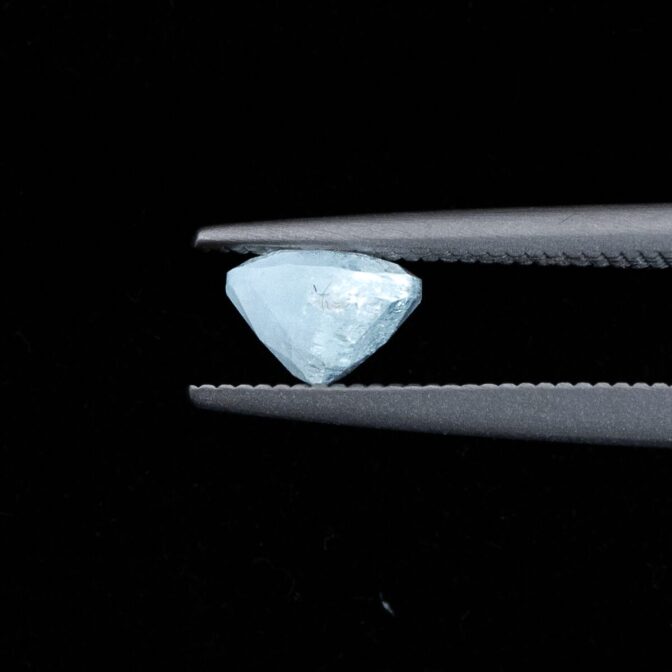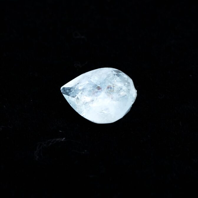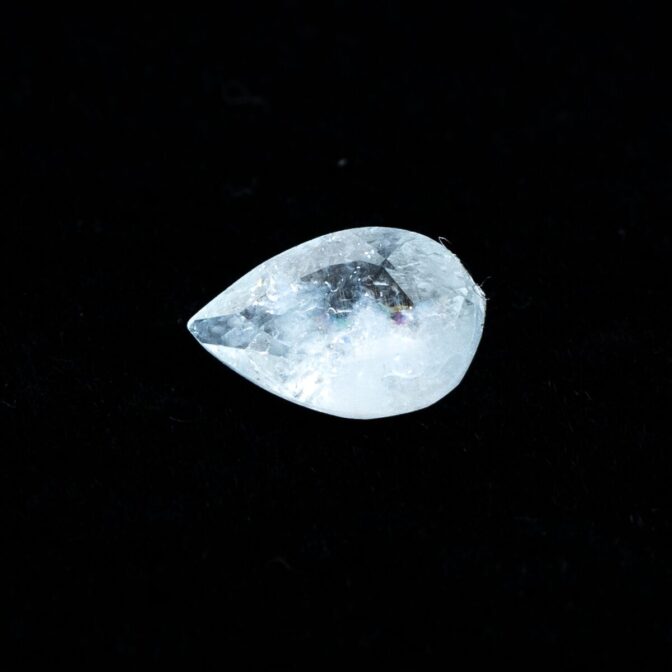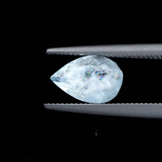 まず驚くのは、華やかに輝く白銀色のインクルージョンが全体に入っている事。それなのに透明度が高く、にごりのない澄んだスカイブルーが目に飛び込んできます。角度を変えるたびスカイブルーから銀色がかったパステルブルーに変化し、その未知の色合いと輝きになす術もなく目を奪われてしまいます。そして、光が当たると虹色の細かなインクルージョンが燦然と輝き出し、幻想的なきらめきを作り出します。よく見るとピンクファイヤクォーツのようにネオンピンクの光の粒子もあり、さすが隣り合う鉱床から採れたアクアマリン。なんと可愛い色ときらめきなのでしょう。