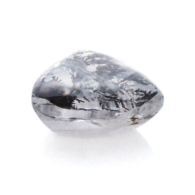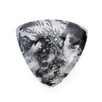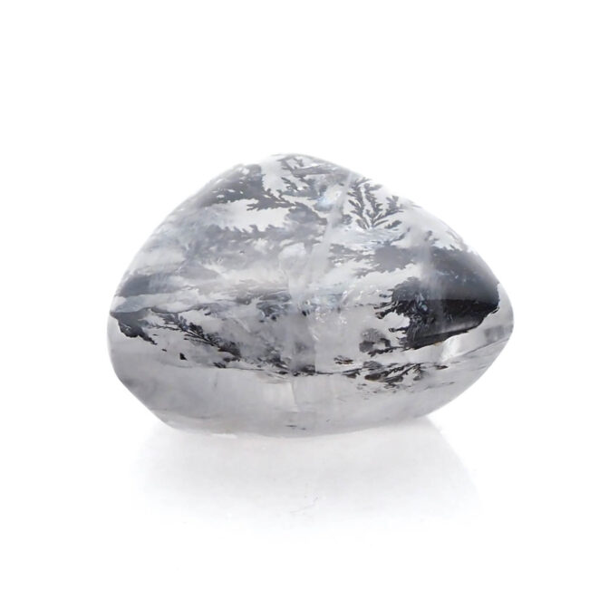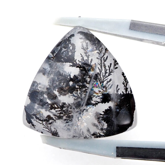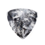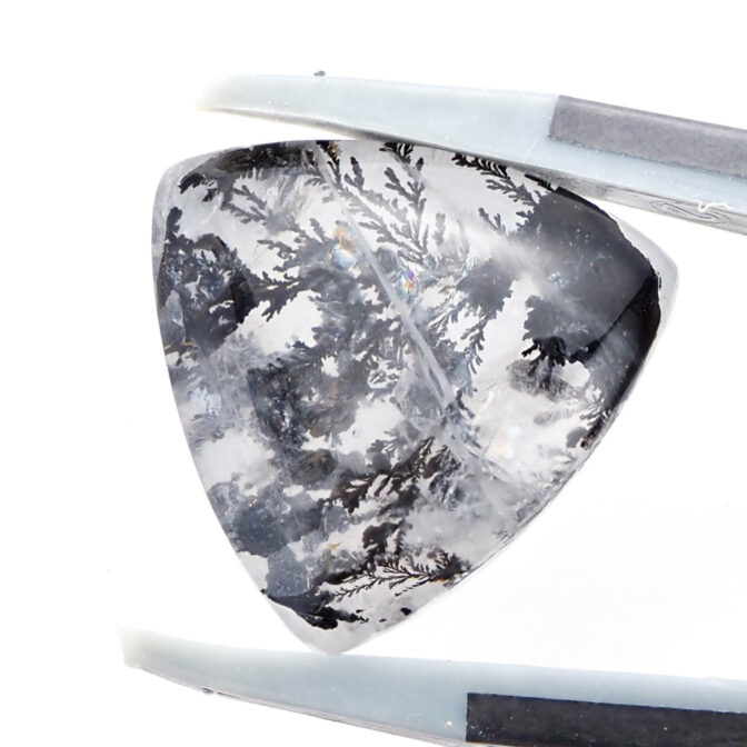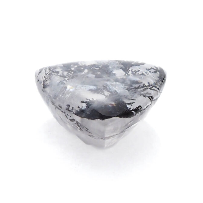 このページでご紹介しているルースは、折り重なるように生い茂るシダの葉のように見える内包物が、人の手が入るのを拒み続ける密林のよう。今まで見てきたデンドリティッククォーツとは一線を画す個性派です。重々しく重厚感があるのに、ふっくらと整えられたトライアングルカボションにカットされているので、尖りすぎない美しさを持っています。とろりとしたミルキーな質感も、ともすればインパクトが強すぎるこの石の印象を和らげています
