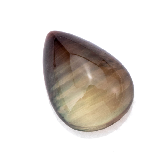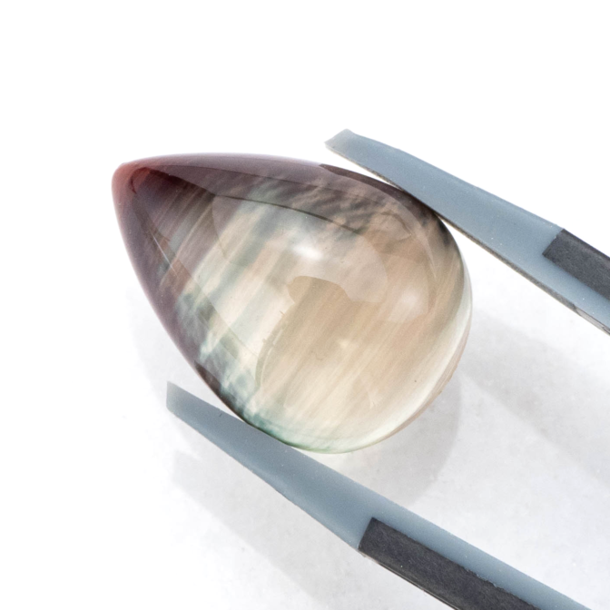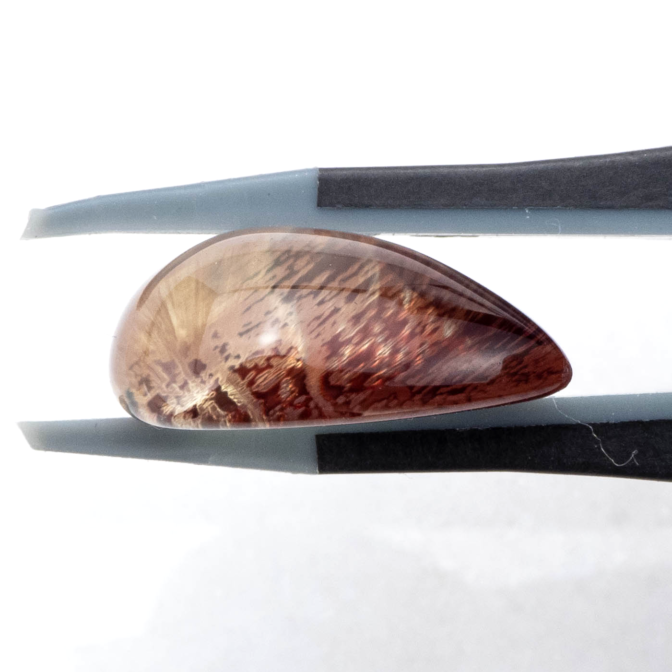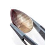 ふっくらと柔らかいティアドロップシェイプのカボションは、左右対称で整った形の美しさも自慢。つややかな輝きが透明度と模様の美しさを際立たせ、上質な輝きを放ちます。大粒ですのでペンダントトップに向きそうです。ちなみに、個人的にリングに仕立てられたルースを見たことがあり、可愛さと綺麗さが同居するとても素敵なジュエリーに変身していました。大粒リングに抵抗がない方は是非ともトライしてみてくださいね。