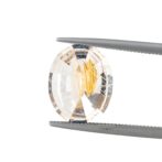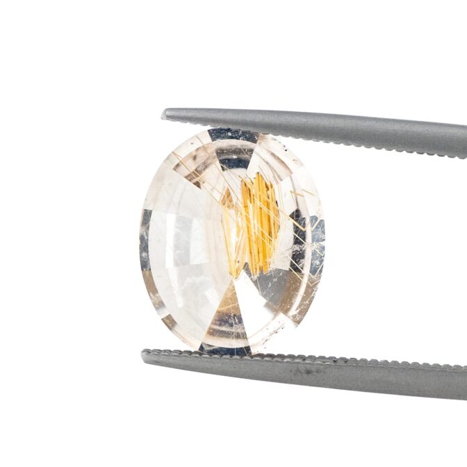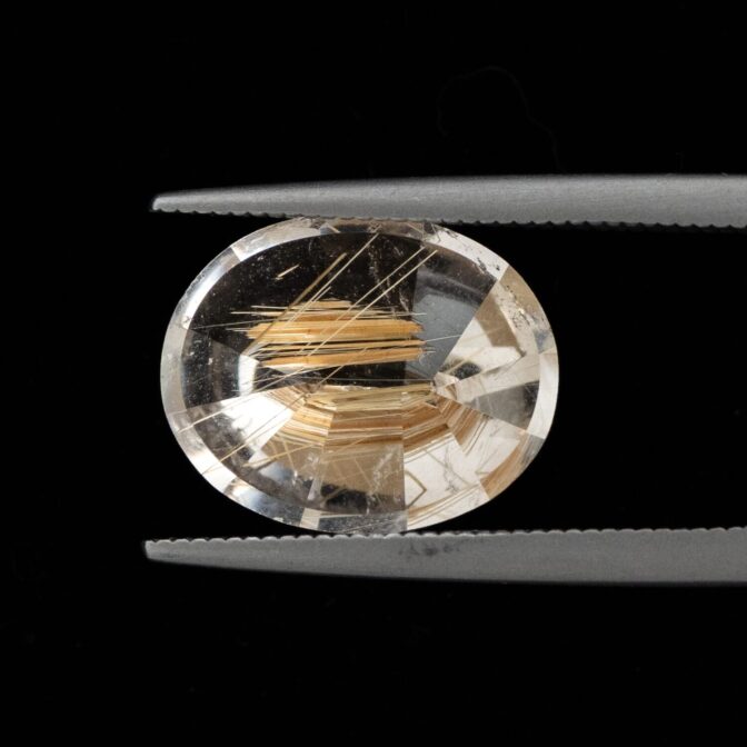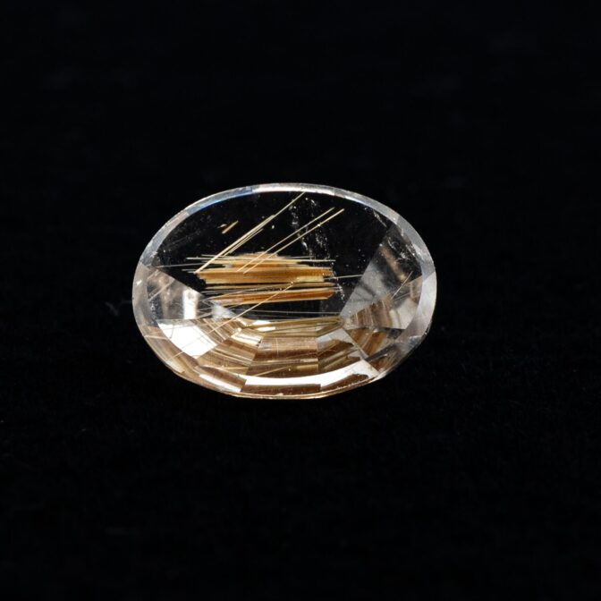 ところが、嬉しいことにツーソンで出会ったルチルクォーツ達の美しいことと言ったら!特にブラジル産でカットと磨きにこだわったルース達の美しさは言葉を失うほどでした。透明で照りがよくキラキラと透明に光るクォーツの中に、金糸を束ねたような澄んだ輝きを放つルチルの束が斜めに走っており、シャープなクールビューティー。余計なものを極限までカットし、シンプルにクォーツとルチルの美しさだけで勝負している潔さも素敵です。