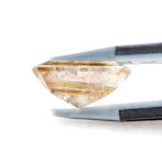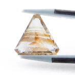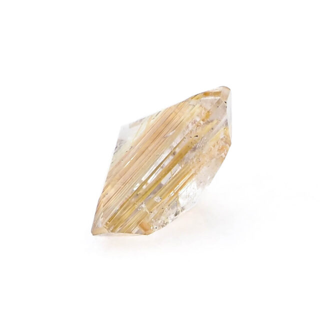 そんな厳しい基準でセレクトしてきたこちらのルチルクォーツは、カットのユニークさが目を惹きます。透明で照りがよくキラキラと光クォーツの中に、金糸を束ねたような澄んだ輝きを放つルチルの束が斜めに走っており、シャープなクールビューティー。余計なものを極限までカットし、シンプルにクォーツとルチルの美しさだけで勝負している潔さも素敵です。普通のルチルクォーツに飽きてしまった方におすすめです。リングに仕立てれば、目をひくユニークな仕上がりになるでしょう。