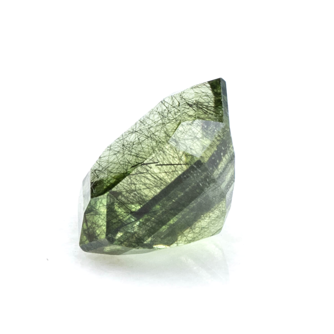 針入トパーズとルチルクォーツはとても似ているように思えます。無色透明の石の中に金色の針が入っていることが共通点ですね。しかし、トパーズとクォーツは屈折率が違うため、輝き方が違うのです。トパーズは反射が強くギラリと鋭利な輝き。屈折率と硬度が高いので光沢が強く、まさにさんざめくようなきらめきをまとっています。対してクォーツの輝きはもう少し静かで、落ち着いた感じ。もし、お手元にトパーズとクォーツの似たようなファセットカットの石があったら、輝きを比べてみるのも面白いですね。