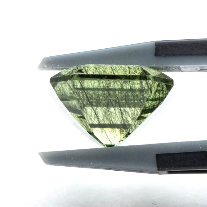 美しいゴールドの針状インクルージョンは一見するとルチルのよう。しかし、トパーズの生成条件ではルチルは結晶として取り込まれません。このインクルージョンの正体は針鉄鉱と言われています。鉱物的にもとても興味深い「針入り」トパーズ。内包物をルーペで観察すると、ごく薄い膜状。これが、クォーツの中に取り込まれているルチルとの違いなのです。