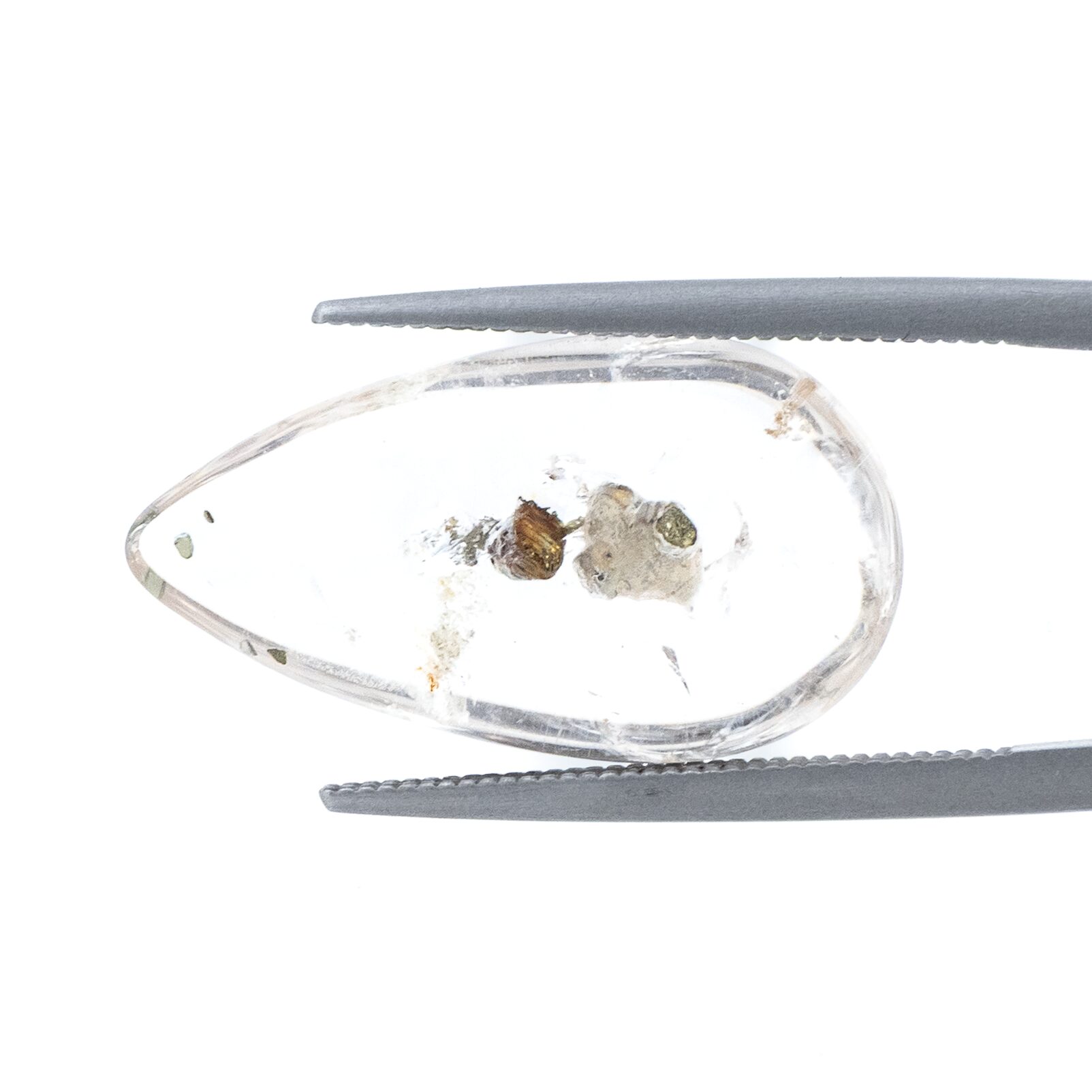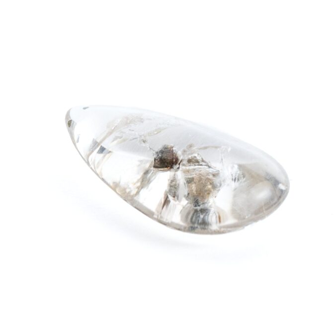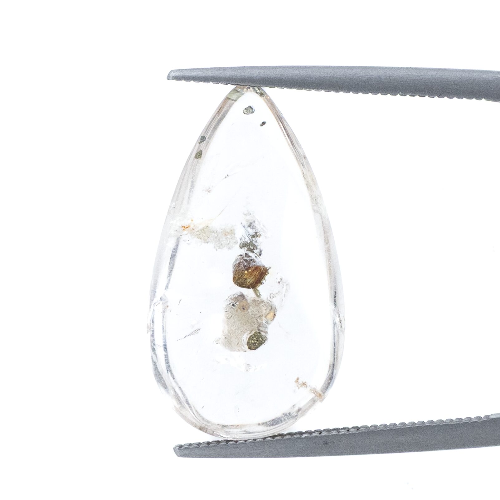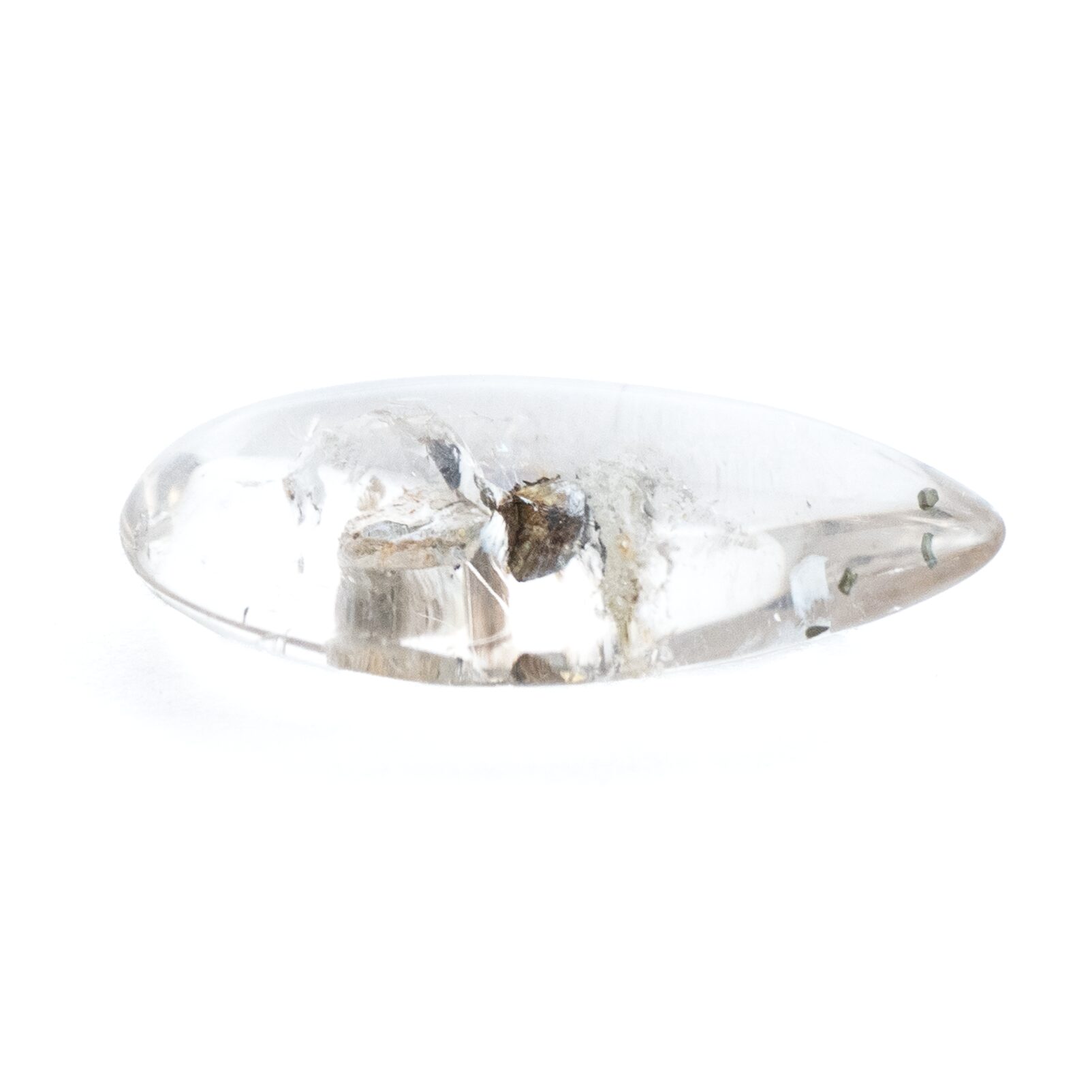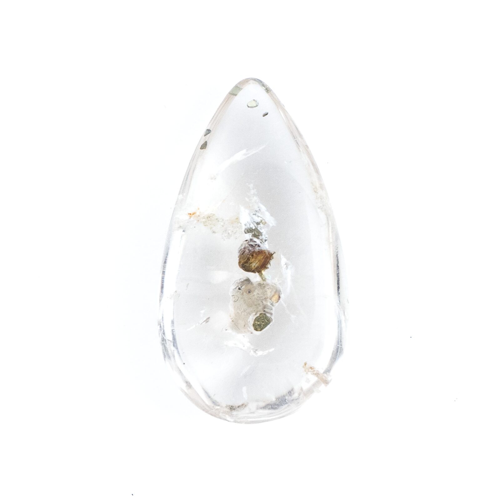 こちらは、透明度の高い澄んだクォーツの中に、多面体のパイライト結晶がキラリ。銀色の輝きとコロコロとした可愛らしさで、ギュッと心を掴まれてしまいました。そのほかにも、いろいろなインクルージョンが縦に連なり、賑やかながらも上品にまとまった雰囲気。これもひとえに青みを帯びて透明な輝きを放つクォーツが上質だから。ごちゃごちゃしていないスッキリ感と、様々なインクルージョンの不思議を一度に味わえる不思議なルースになっています。