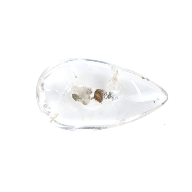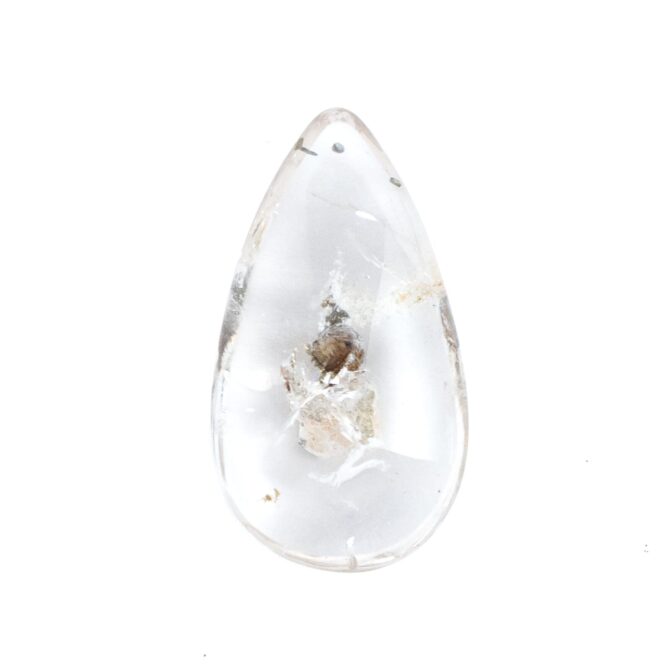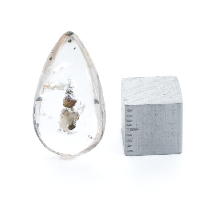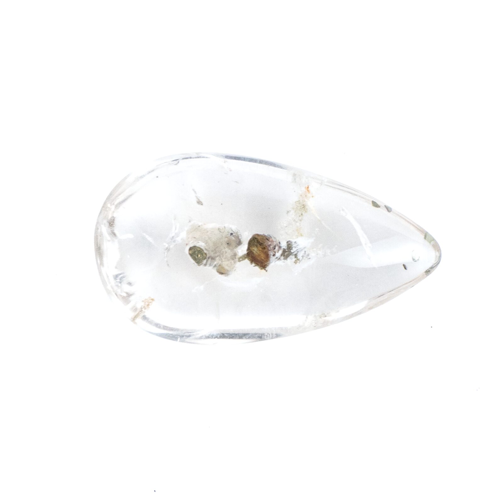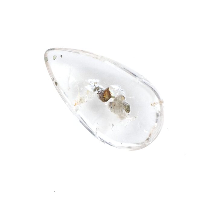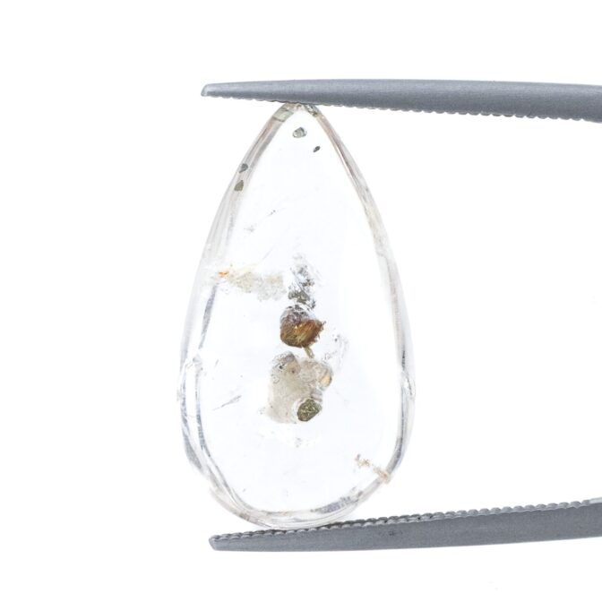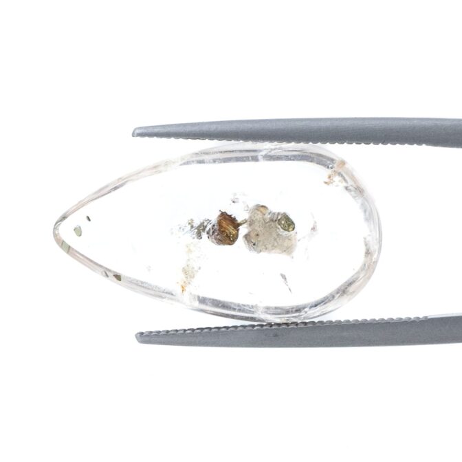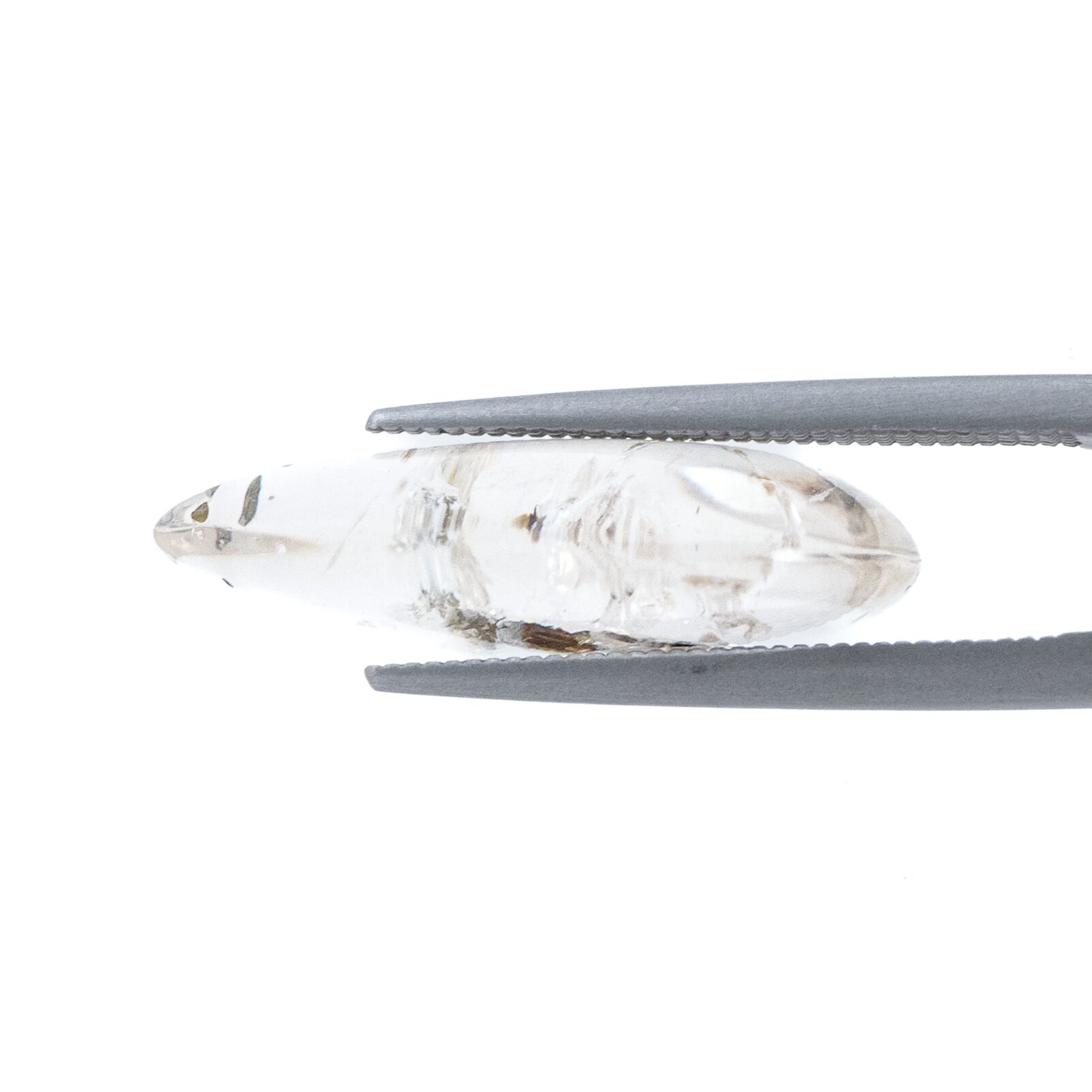 こちらは、透明度の高い澄んだクォーツの中に、多面体のパイライト結晶がキラリ。銀色の輝きとコロコロとした可愛らしさで、ギュッと心を掴まれてしまいました。そのほかにも、いろいろなインクルージョンが縦に連なり、賑やかながらも上品にまとまった雰囲気。これもひとえに青みを帯びて透明な輝きを放つクォーツが上質だから。ごちゃごちゃしていないスッキリ感と、様々なインクルージョンの不思議を一度に味わえる不思議なルースになっています。