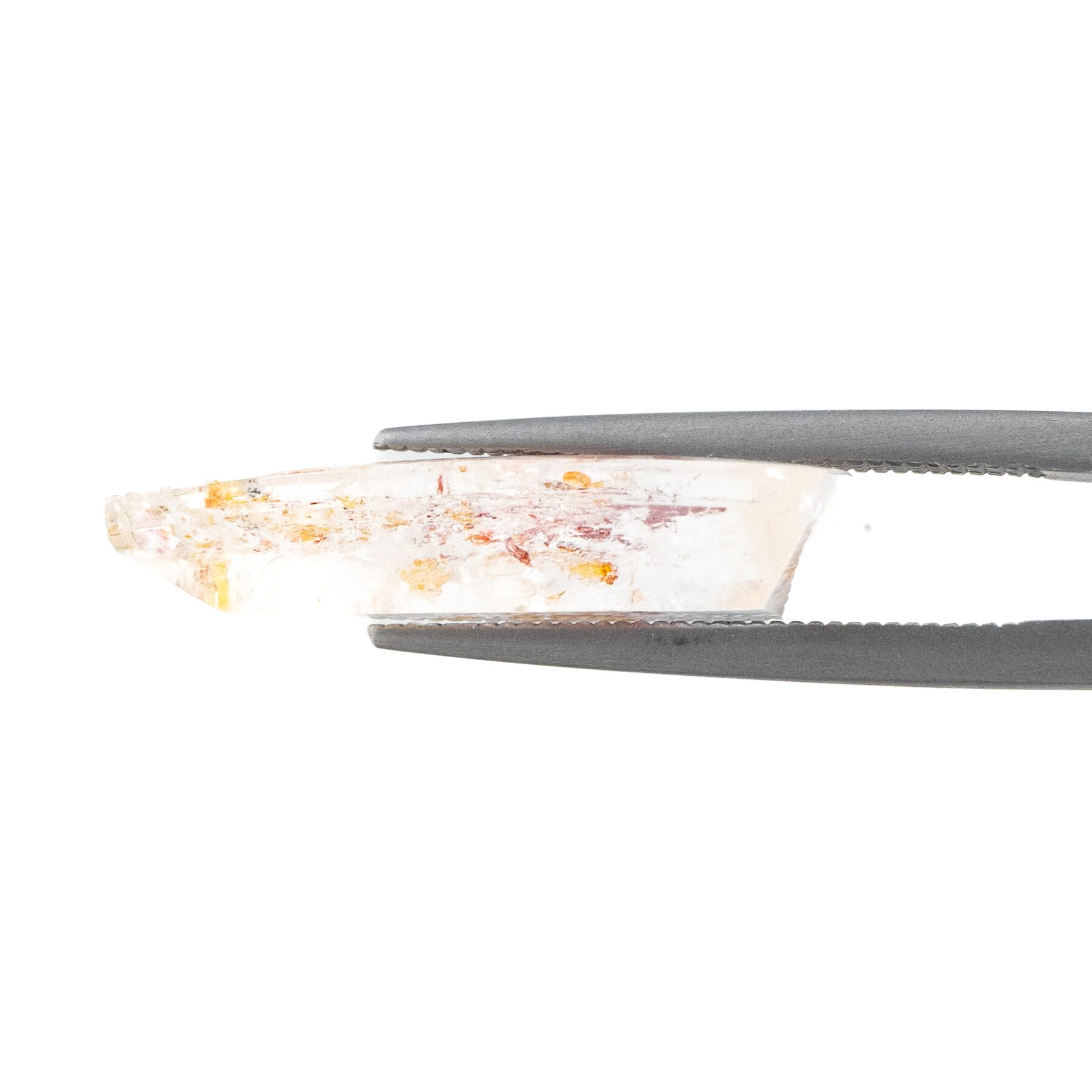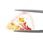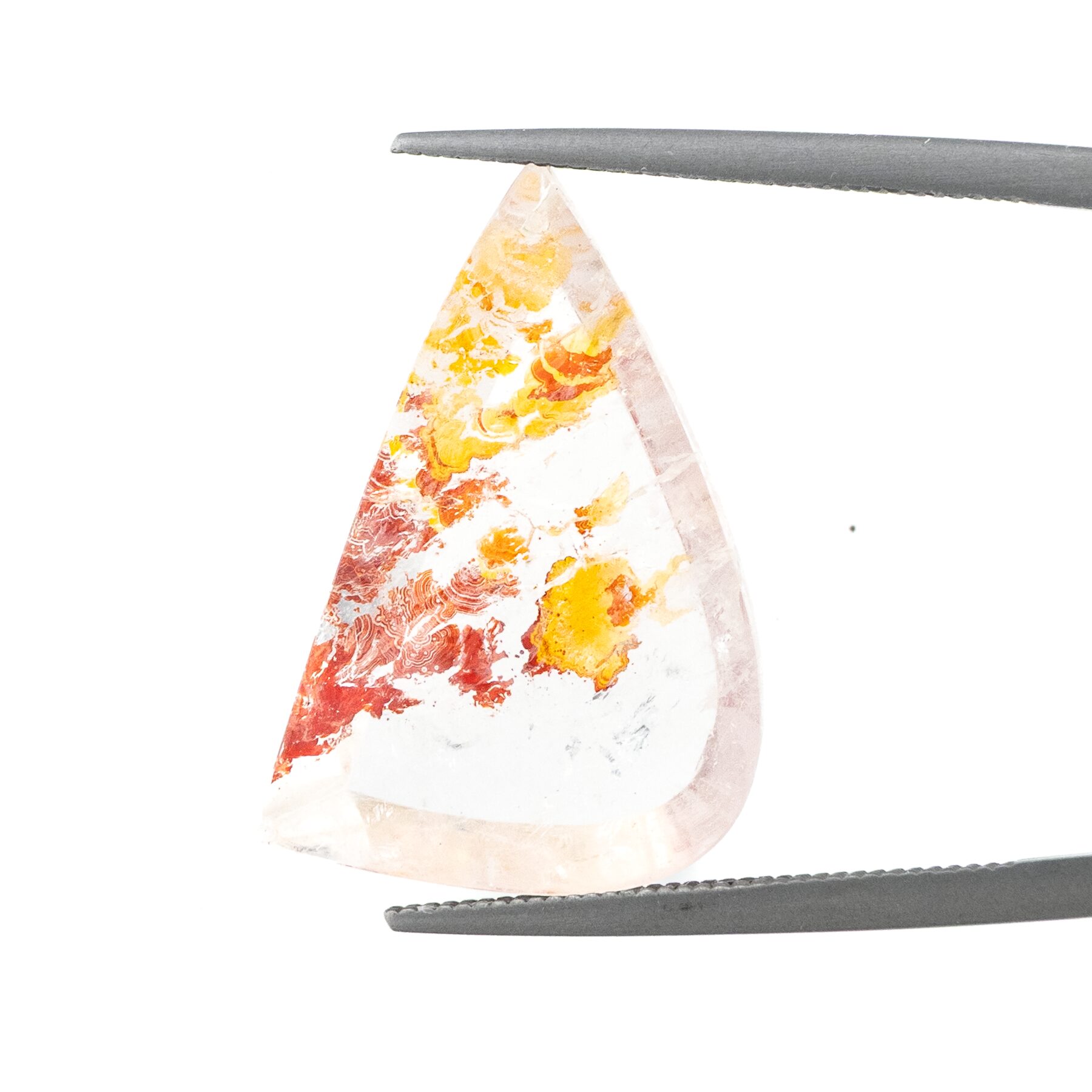 このページでご紹介しているリモナイトインクォーツは、ふっくら曲線で構成されたクォーツにレッドとイエローのリモナイトらしい色彩が大変美しい状態で入り込んでいます。余白を活かした石取りで大粒なのに軽やか。ジュエリーとして身につけた時でも重さが感じられないのに大粒の見栄えが楽しめるバランスの良いルースです。