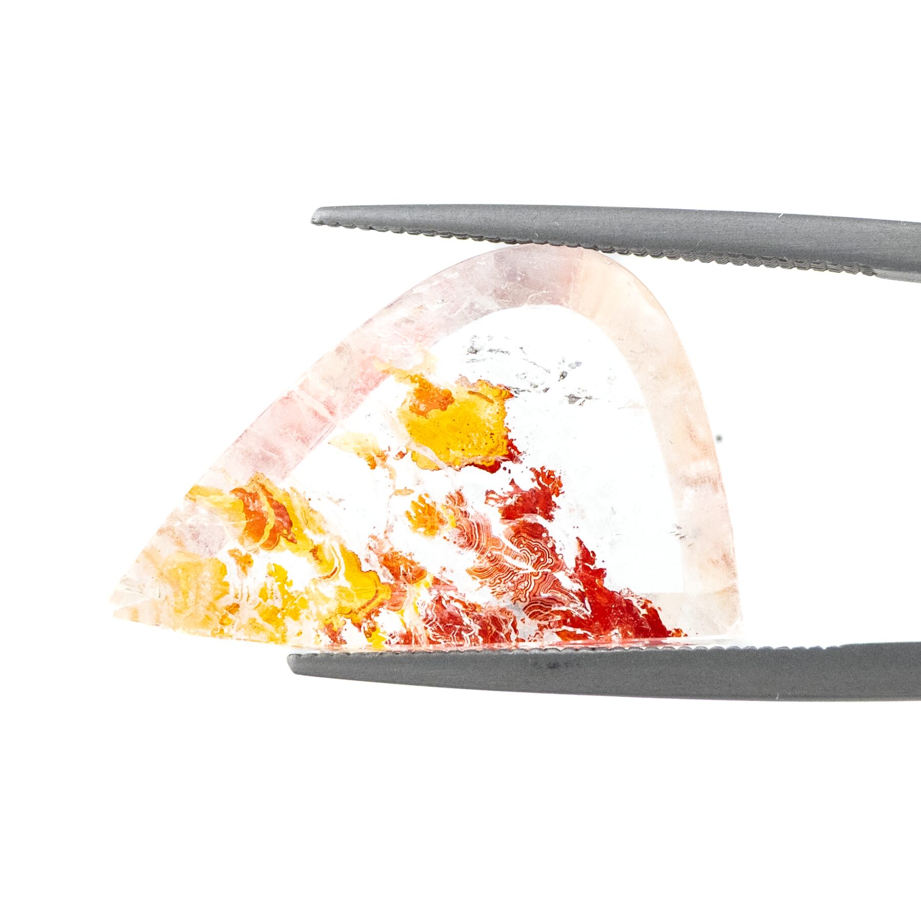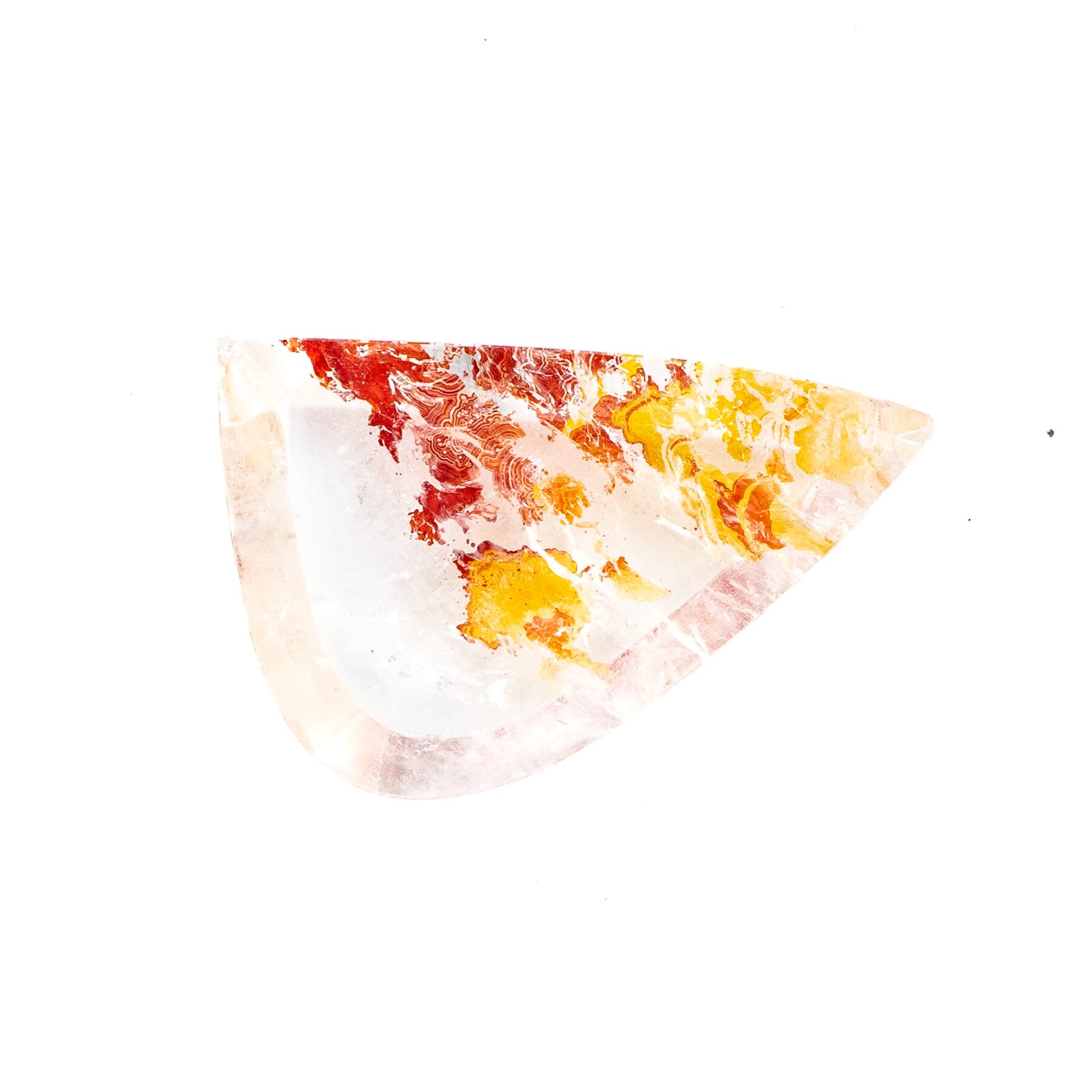 燃えたつように華麗なレッドとイエロー。大胆な色彩美が透明なクォーツの中で輝く大粒リモナイトインクォーツです。手書きの友禅染めのごとく優美で繊細な模様は、洗練された中に匂い立つような艶やかさがあり、和の趣き。一方で激しく渦巻く自然のエネルギーをそのまま石に閉じ込めたような、野趣あふれる雰囲気を持ち合わせており、ダイナミックな美しさと荘厳さを楽しめる個性豊かなルースです。