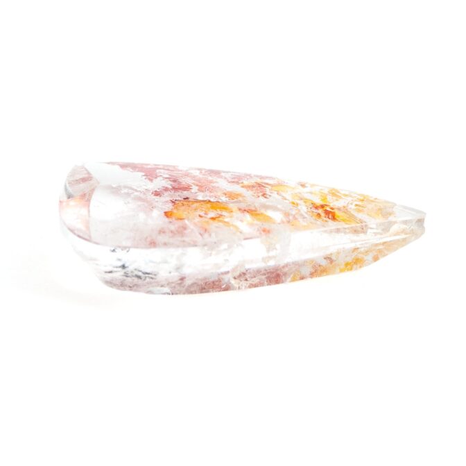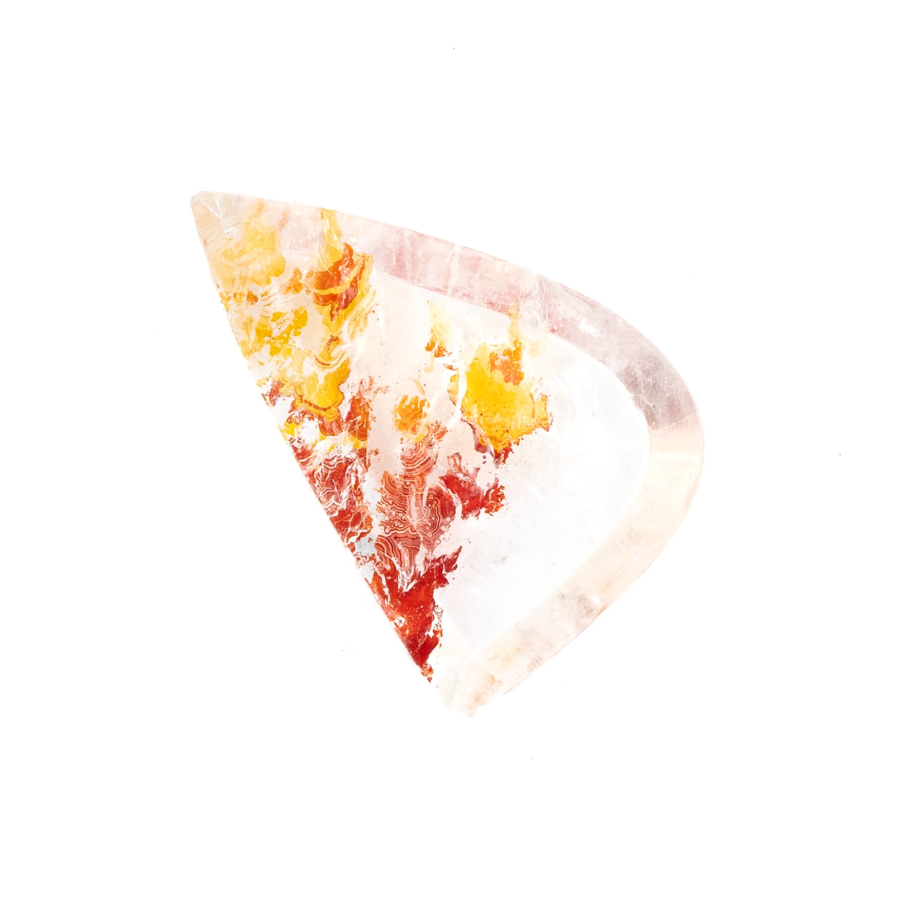 鮮やかな色彩をクォーツの中に閉じ込めたリモナイトインクォーツ。その正体は、酸化鉄などの色の出る成分が被膜状にクォーツの結晶の間に染み込んだもの。にごりの無い澄んだレッドとイエローがクォーツの中でゆらゆらとゆらめいているような、大胆な色彩美から目が離せません。仕組みを知っていてもその不思議さに感動すら覚えます。大地のいたずら心が生み出した芸術品は全て一点もの。