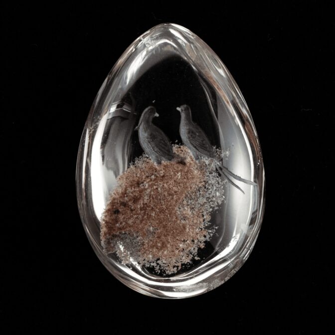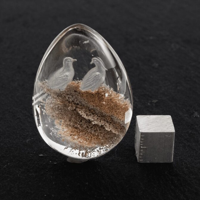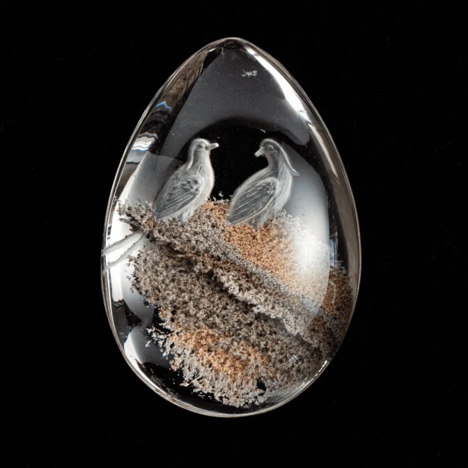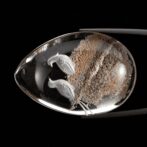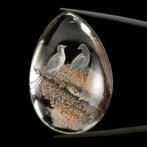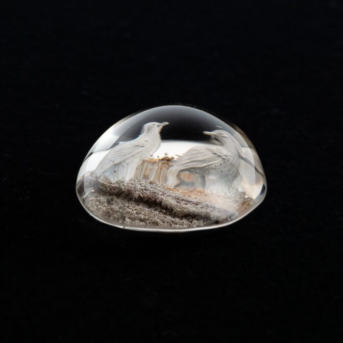 と思っていたのに、今回の香港買い付けで出会ってしまったのが、こちらのインタリオ入りガーデンクォーツ。そんなバカな、と思って二度見ならぬ三度見をしてしまいました。まるで透明な湖の水をそのまま石にしてしまったかのような純粋な輝きの中に、明るくカラフルなインクルージョン。そして、クォーツが作り出す庭で戯れる、躍動感あふれる2羽の鳥たち。鮮やかな彫りのインタリオで表現された、神秘的な世界。鳥好きはもちろん、そうでなくても惹きつけられる、今どき珍しいほど凝った作りのルースで、素晴らしい芸術品です。数千年の間、石を「玉」と呼び、大切に扱ってきた国だからこそできることだと思います。
