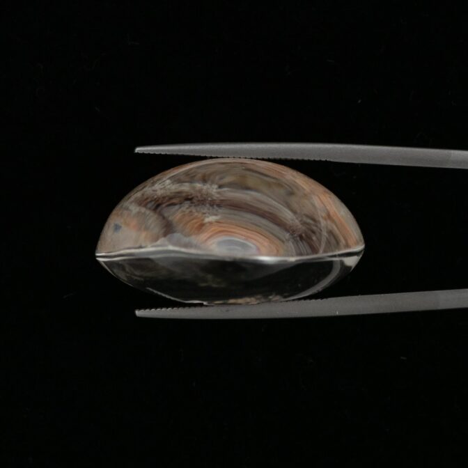 そして、もう一つまるむ商会がこだわる技法がインタリオ。ルースの裏側から模様を彫り込む技法です。表から見える模様を裏から彫り込むため、とても手間がかかります。少し彫り進めては裏返し、見え方を確認しつつ調整を加えるという工程を繰り返すので、通常の浮き彫りよりもさらに時間がかかるのです。さらに、普通の宝石研磨とは違うスキルが必要なため、研磨の名人でもインタリオができる方は数少なく、大変に希少。インタリオとして美しく見えるためには、かなりの深さで固い石を繊細に掘り続ける為、スキルだけではなく長年の経験と根性も必要です。
