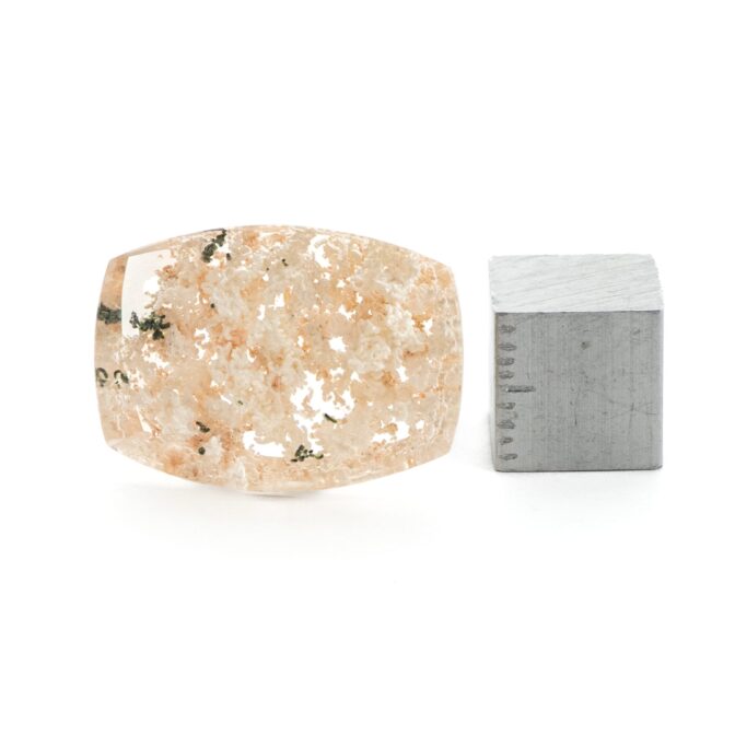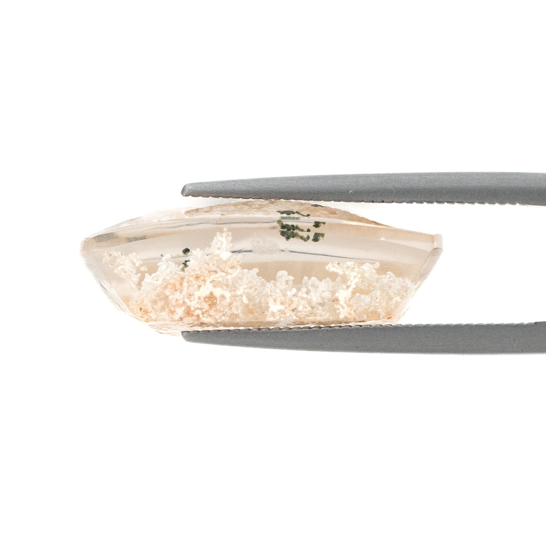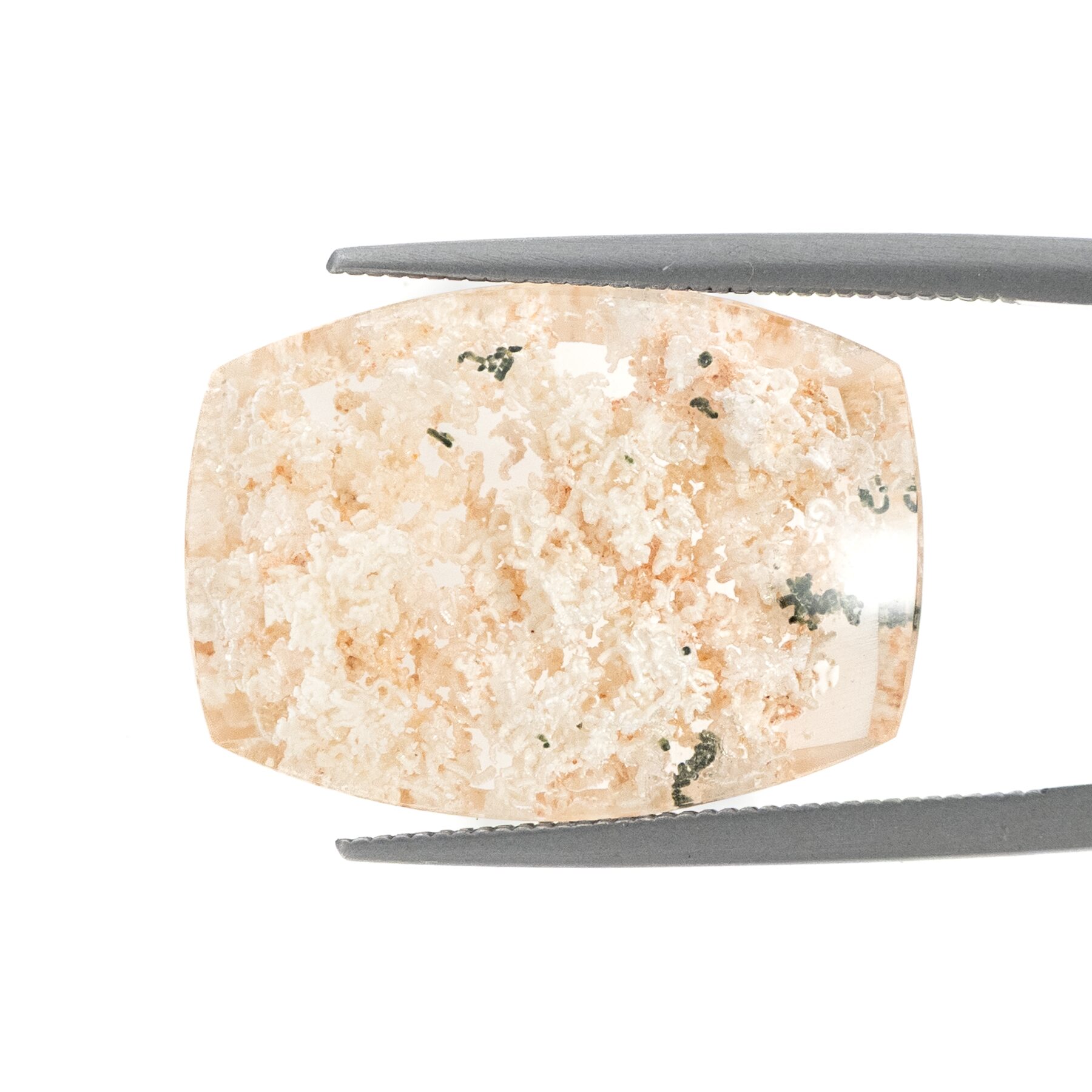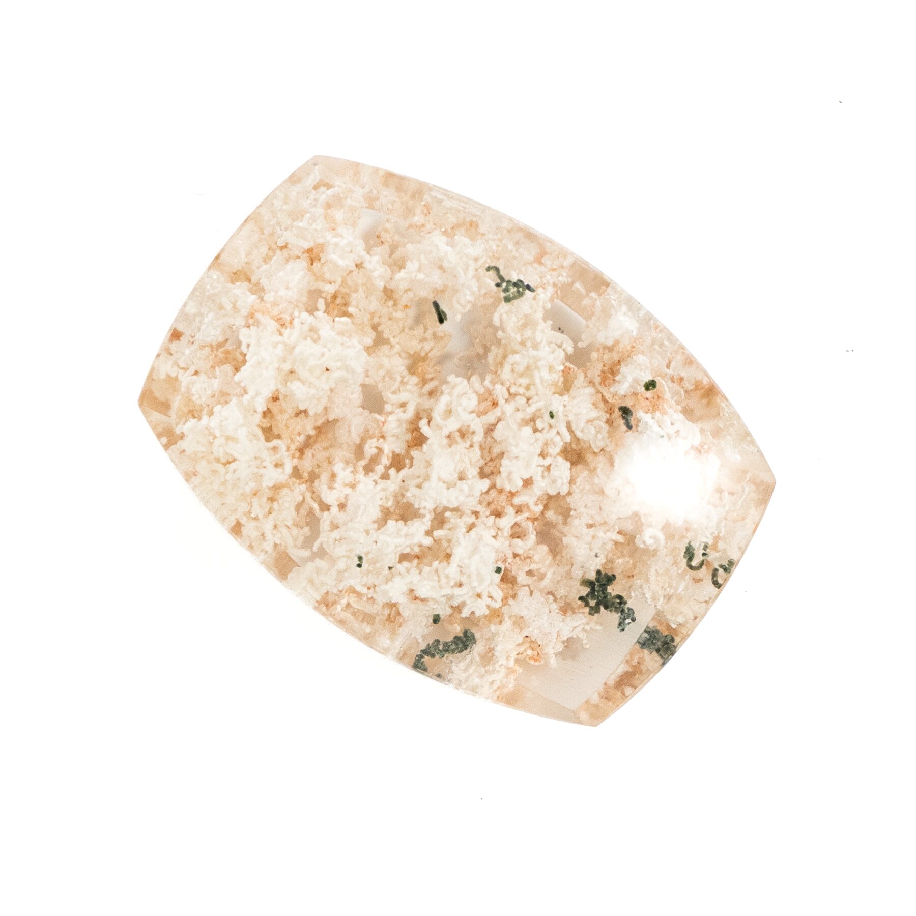 このページでご紹介するのは、明るく眩しいホワイトカラーの中に、ほんの少しピンクが含まれた可愛らしい印象のルース。ちらりと見える、グリーンが芽吹きの季節を彷彿とさせ、清楚な美しさの中にもしっかりとした生命力を感じることができます。身につけているだけで元気になれそうなルースなので、ジュエリーにするのもおすすめ。