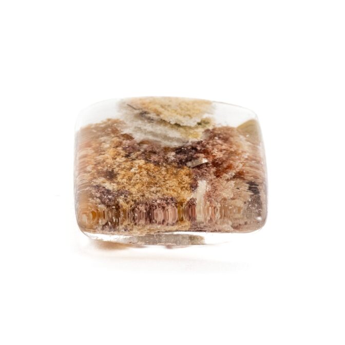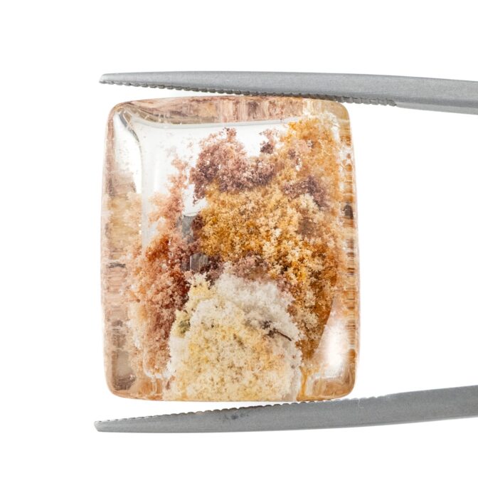 重厚さはないサイズ感ですが、正方形に近い形でリングにするにはやや大ぶり。縦使いだとスッキリ治まりそうです。存在感があるので、ペンダントにするのもおすすめ。ジュエリーには加工せず、あえてルースのまま眺めるのも良いですね。インクルージョンが持つ色彩の豊かさに、見つめていると心が満たされます。