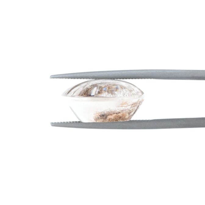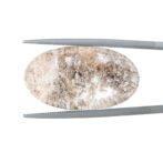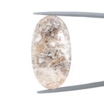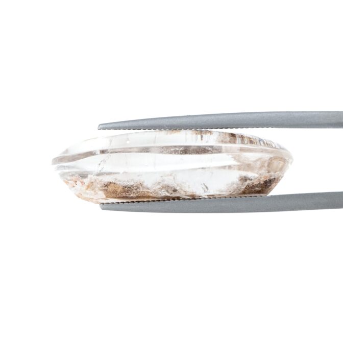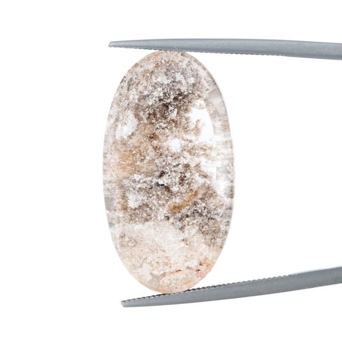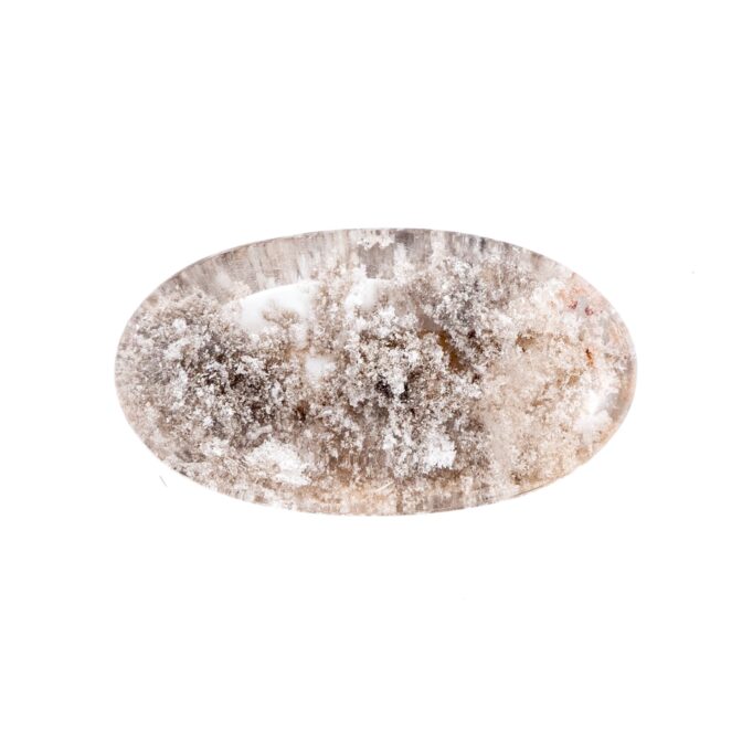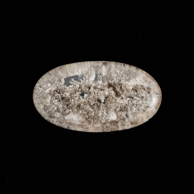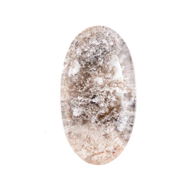 このページでご紹介するのは、シックで落ち着いた雰囲気のホワイトガーデンクォーツ。細長いオーバルという洒落た形にカットされ、つやめく水晶の中に宿るインクルージョンは、野に咲く名も知らぬ白い花のように美しい佇まいです。カラフルなガーデンクォーツももちろん美しいですが、こんな静謐な空気を持つルースも、見ていて心穏やかになるものですね。