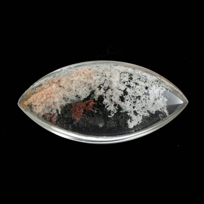 <店主の偏愛ポイント>春に一斉に花咲く雪柳のような可憐さと華やかさをもつ美しいガーデンクォーツ。白だけではなく、緑と赤が時々混じるところがガーデンクォーツらしく、退屈しないルースです。厚みがなく、軽やかなので実はペンダントヘッドにも向いているのではないかと密かに思っています。