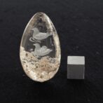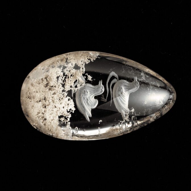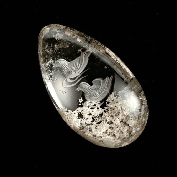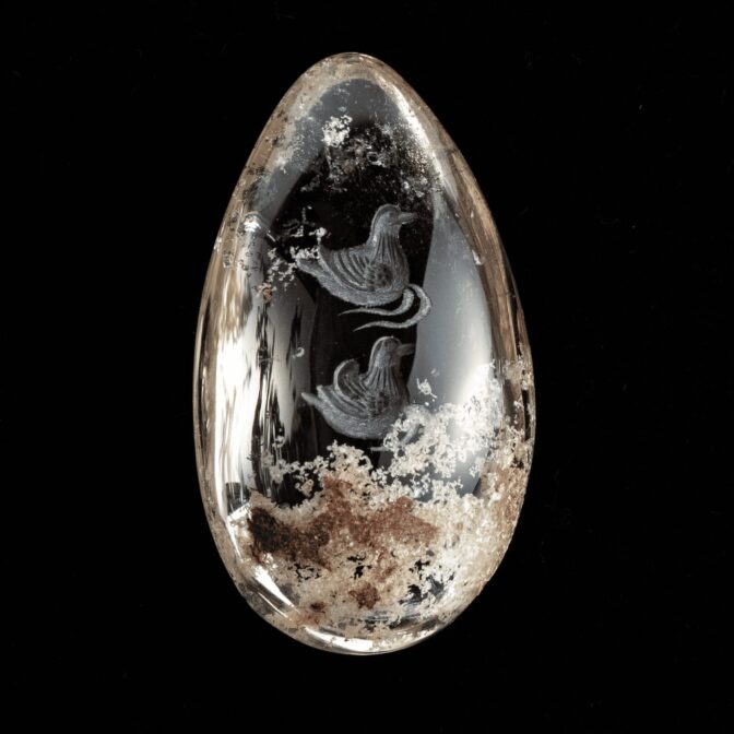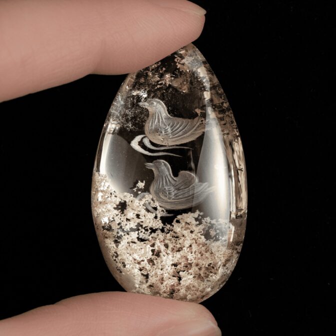と思っていたのに、今回の香港買い付けで出会ってしまったのが、こちらのインタリオ入りガーデンクォーツ。そんなバカな、と思って二度見ならぬ三度見をしてしまいました。まるで透明な湖の水をそのまま石にしてしまったかのような純粋な輝きの中に、明るくカラフルなインクルージョン。そして、クォーツが作り出す庭で戯れる、躍動感あふれる2羽の鳥たち。鮮やかな彫りのインタリオで表現された、神秘的な世界。鳥好きはもちろん、そうでなくても惹きつけられる、今どき珍しいほど凝った作りのルースで、素晴らしい芸術品です。数千年の間、石を「玉」と呼び、大切に扱ってきた国だからこそできることだと思います。