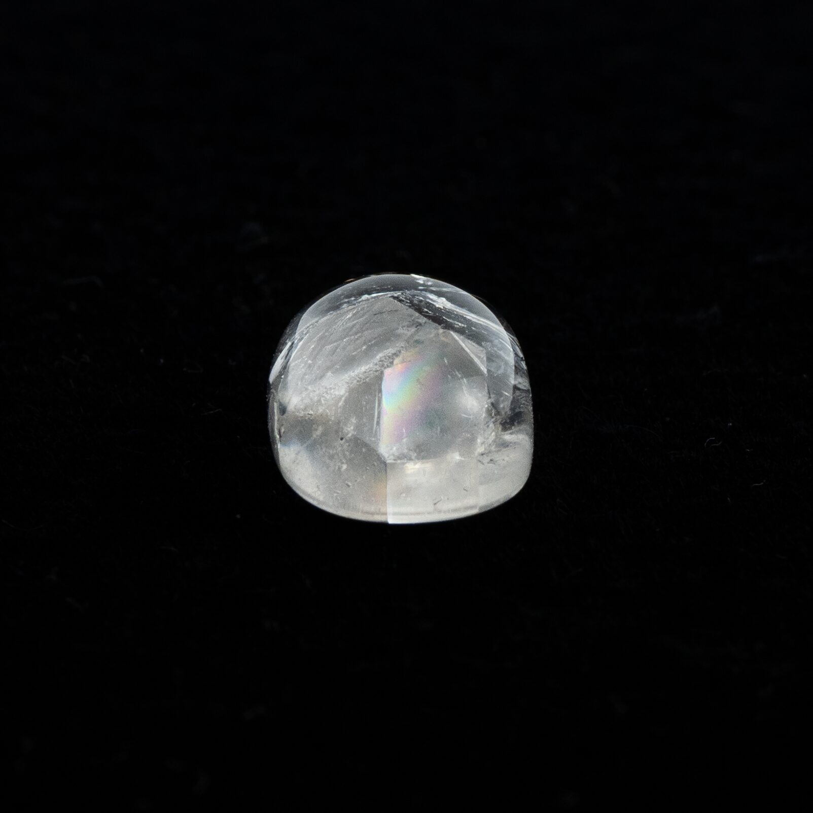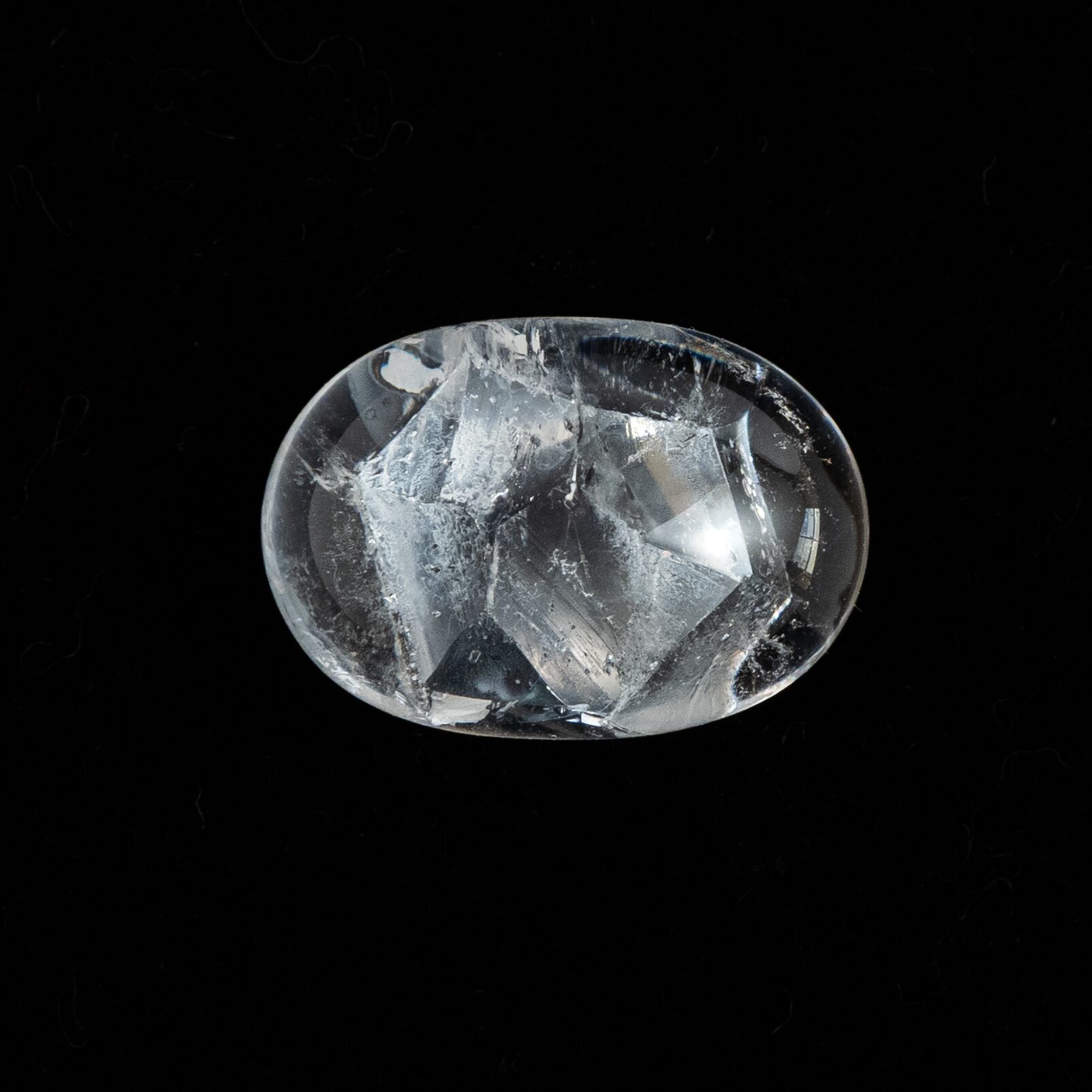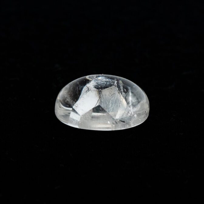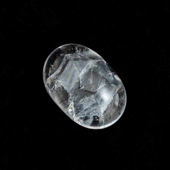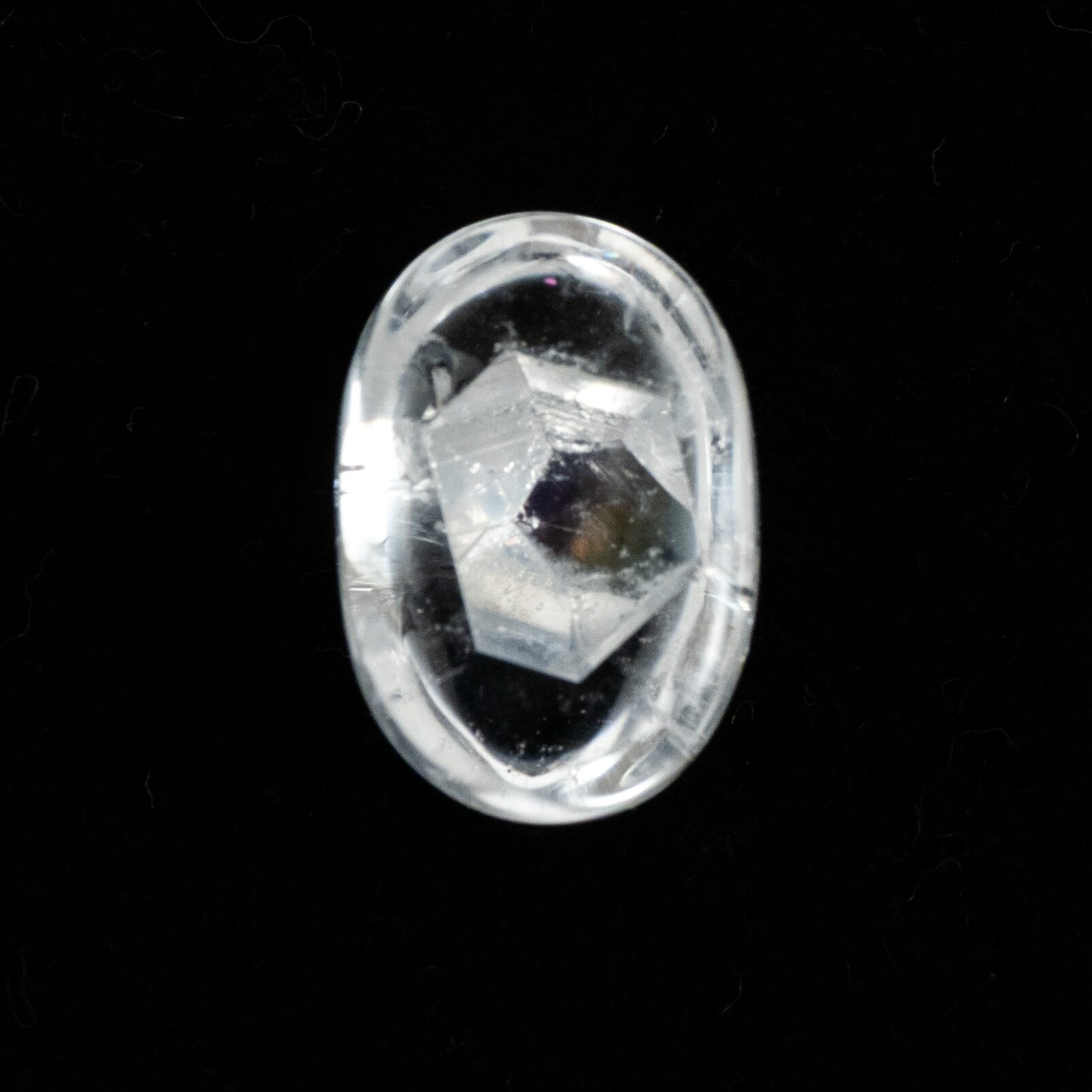 とはいえ、(見ればわかる??)私は筋金入りの個性派。普通の柱状結晶が普通に入っているくらいではあまり心惹かれません。そんな私が見た瞬間飛びついてしまったのが、こちらのクォーツインクォーツです。一見白く透明に輝くシンプルなカボションカットの水晶ですが、その大きさいっぱいに、サッカーボールのようにも見える7面体のクォーツが入っています。なんて可愛らしくも個性的なんでしょう!一つ一つの面が周囲の景色をほんの少し反射させ、とてもミステリアス。どちらのクォーツも極めて透明度が高く、氷のようにひんやりとした質感。可愛さとクールさが同居し、一度見たら忘れられない魅力です。