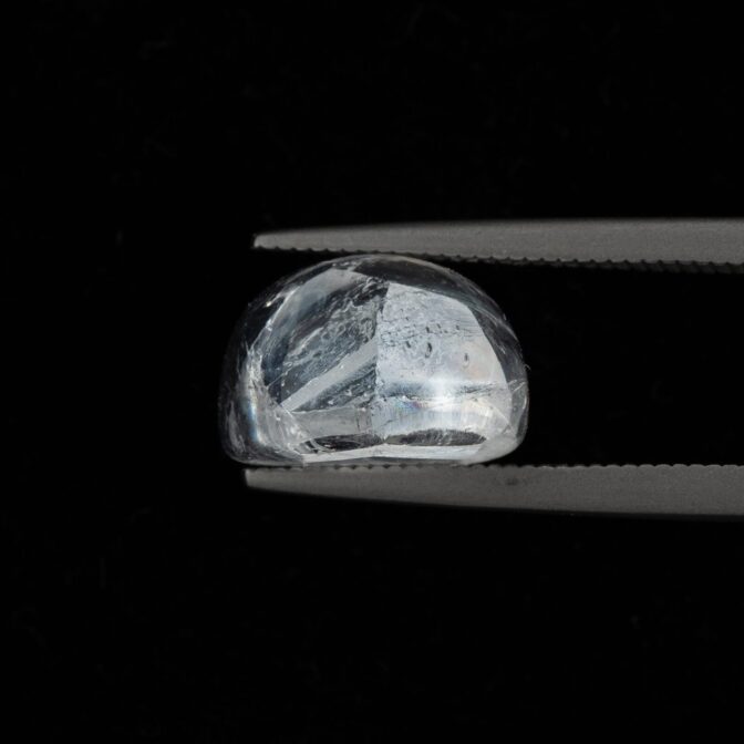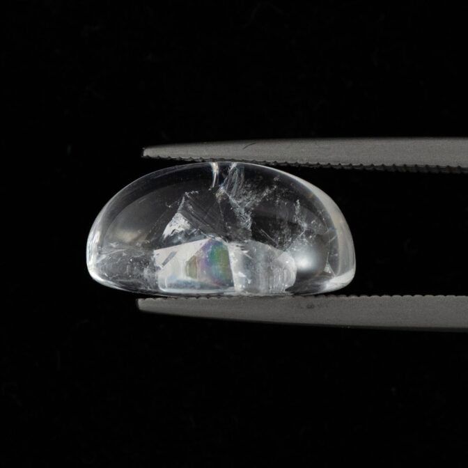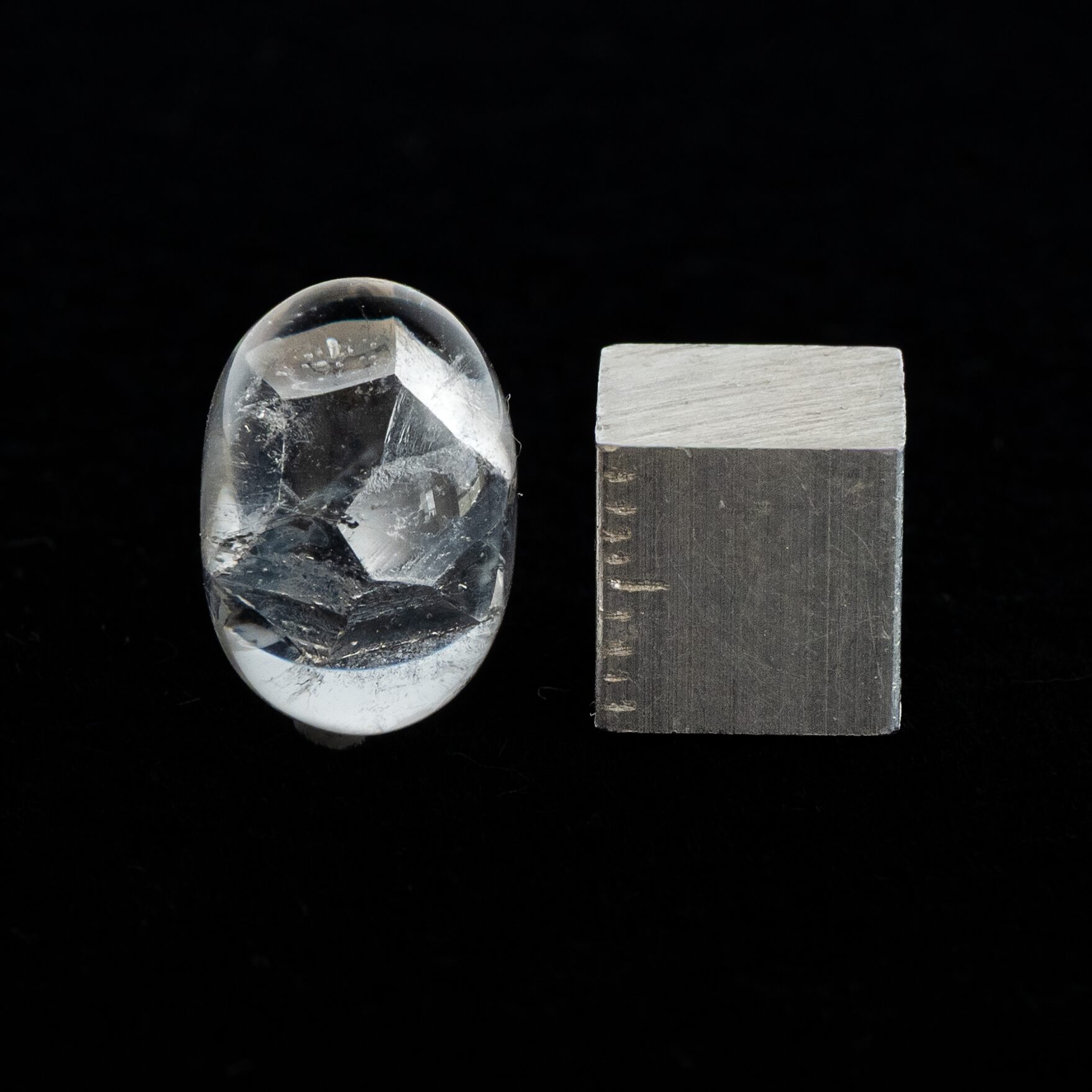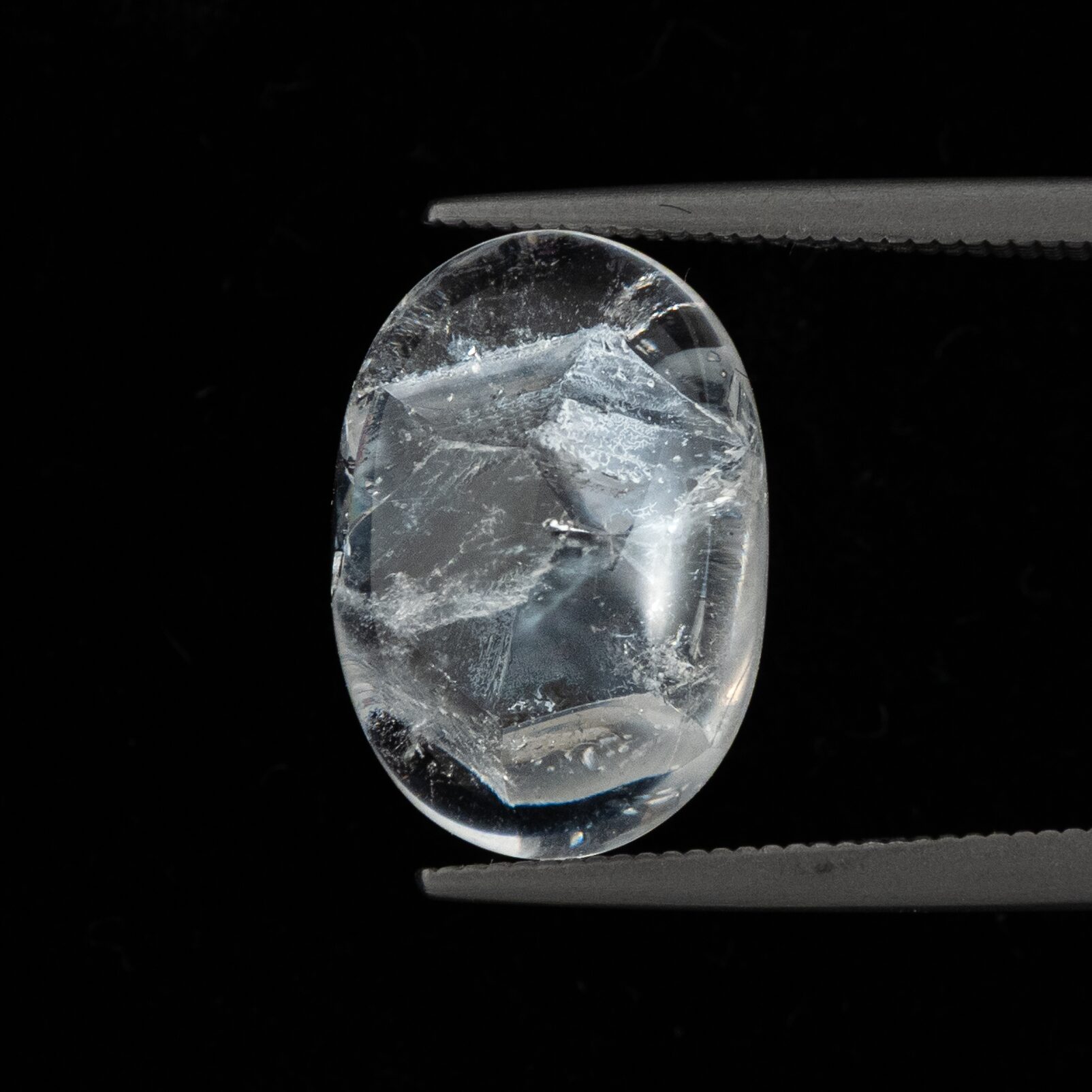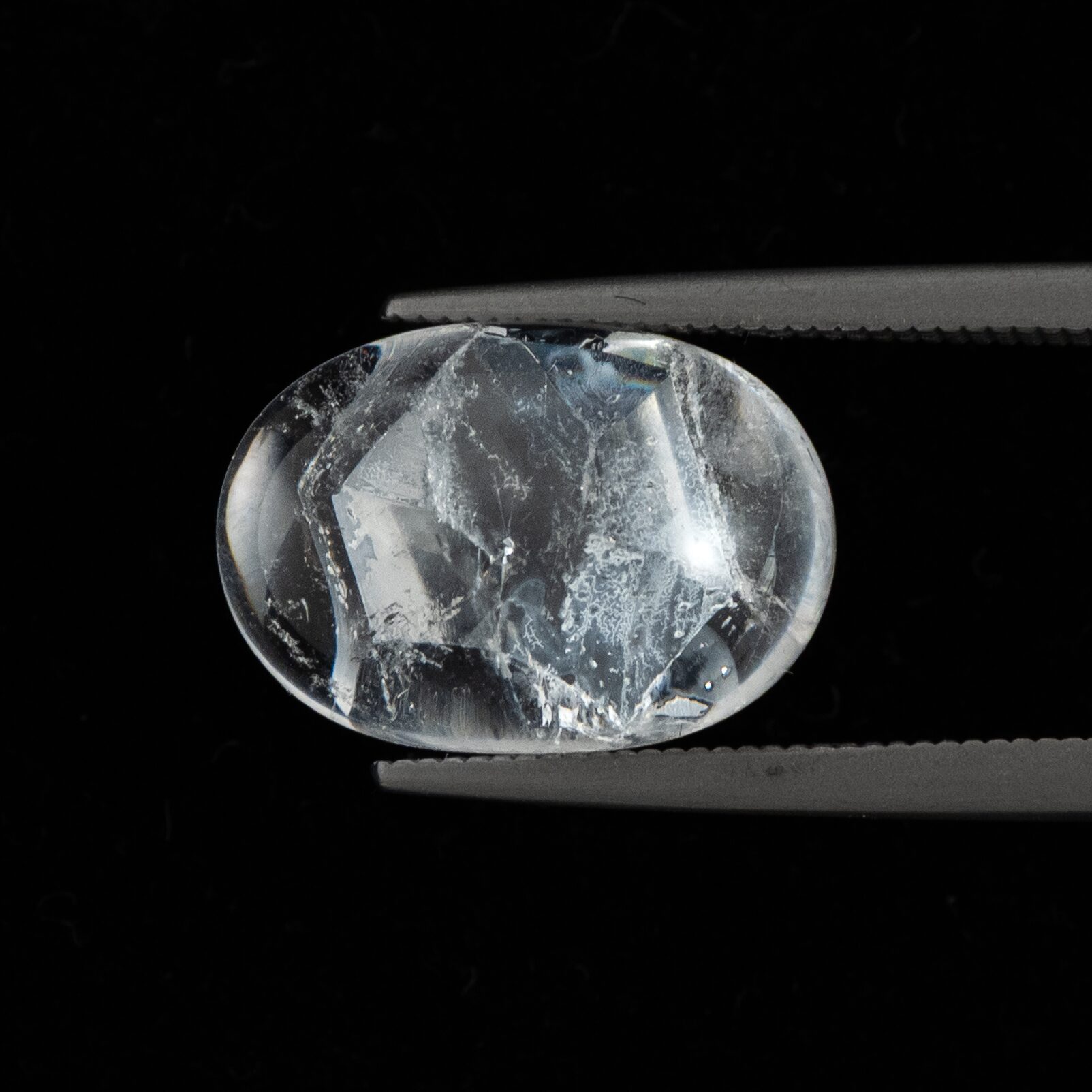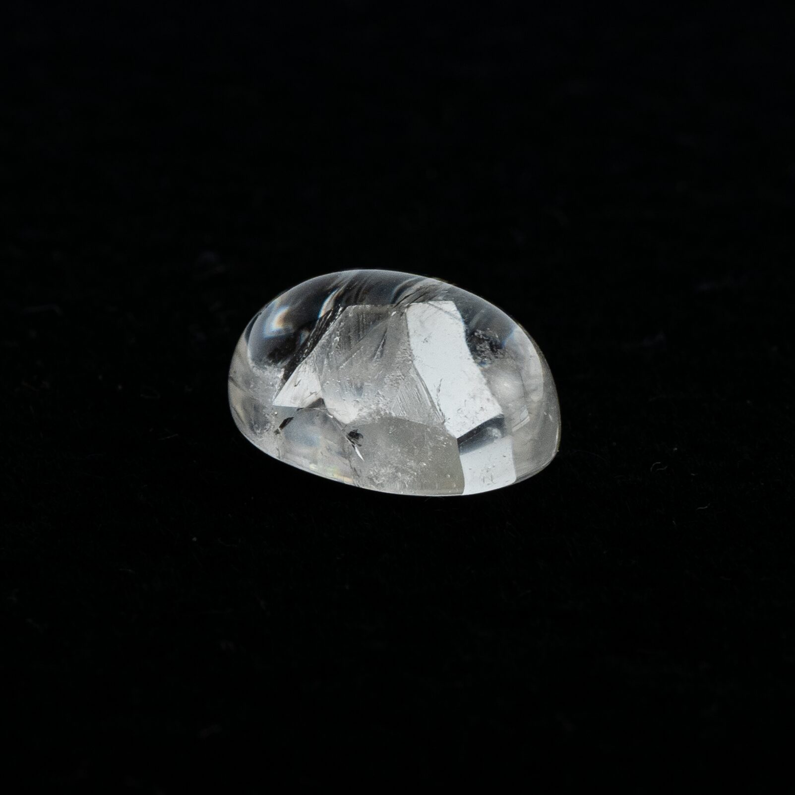 とはいえ、(見ればわかる??)私は筋金入りの個性派。普通の柱状結晶が普通に入っているくらいではあまり心惹かれません。そんな私が見た瞬間飛びついてしまったのが、こちらのクォーツインクォーツです。一見白く透明に輝くシンプルなカボションカットの水晶ですが、その大きさいっぱいに、サッカーボールのようにも見える7面体のクォーツが入っています。なんて可愛らしくも個性的なんでしょう!一つ一つの面が周囲の景色をほんの少し反射させ、とてもミステリアス。どちらのクォーツも極めて透明度が高く、氷のようにひんやりとした質感。可愛さとクールさが同居し、一度見たら忘れられない魅力です。