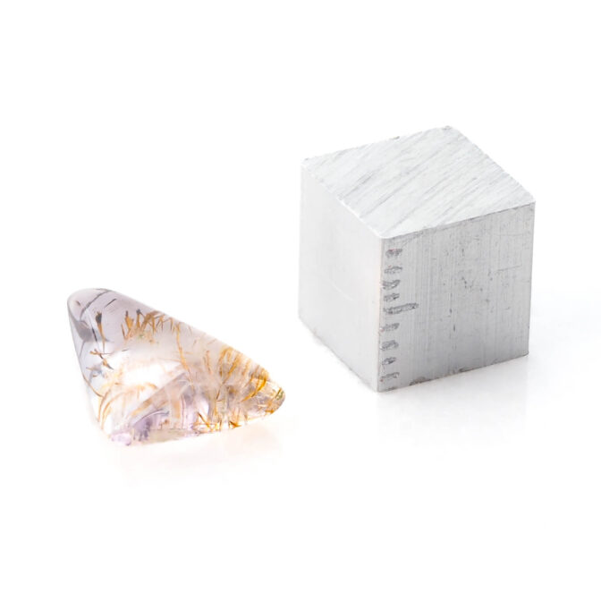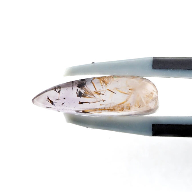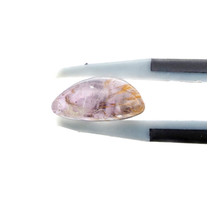 今までどちらかというと、インクルージョンが緊密に散りばめられ、緊張感あふれるゲーサイト入りの石たちをご紹介してきました。ですが、今回はちょっと趣向を変えて、思い切って遊び心があるルースをセレクト。線香花火が生み出す火花のように見えるゲーサイトが、うっすら紫のアメジストの中で生き生きと踊っているように見えます。躍動感がありながらも、気持ちが和らぐようなリラックス感を持つ、多面的な魅力のルースです。