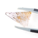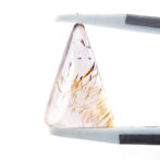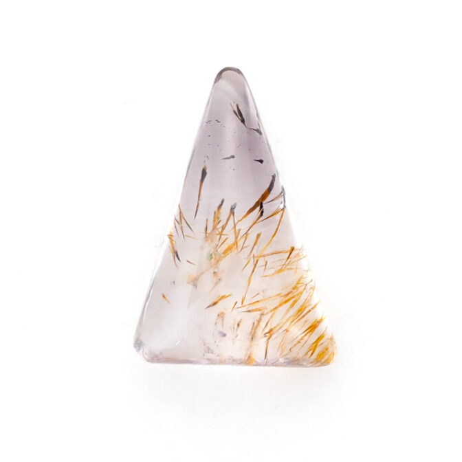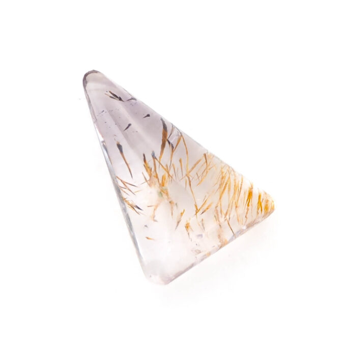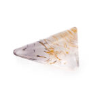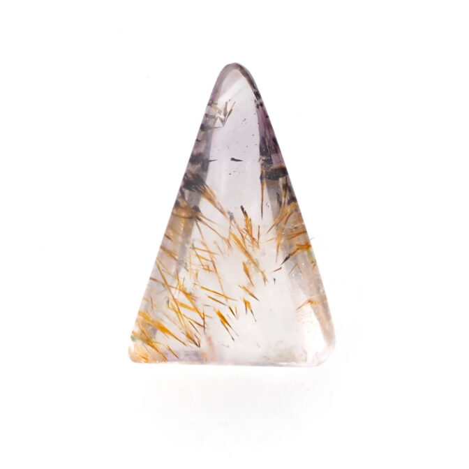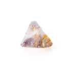 このゲーサイトインアメジスト、不純物が豊かな表情を作り出しているため、なかなか美しい個体に出会うのが難しいのが難点。濁っていたり、クラックがはいっていたり、研磨がきちんとできなかったり。でも、美しい個体に出会えた時、そのユニークさは一目で虜になってしまうほど。このページでご紹介しているルースも、ぷるぷるに磨き上げられ、ふっくら優しい表情です。二等辺三角形の個性的な形は、どこにも尖ったところがなく、素直に可愛いと思えます。ポップな要素もありながら、抜群の透明感で上質さも持ち合わせています。