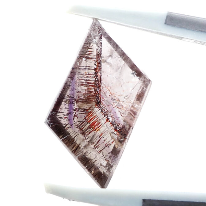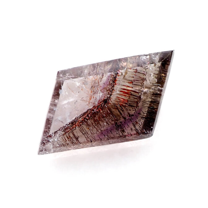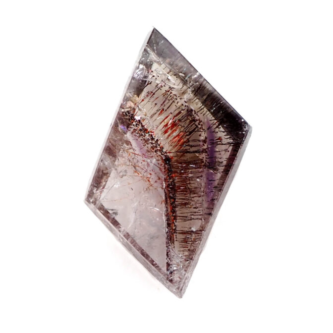 うっすら紫色のアメジストに赤と黒の繊細なゲーサイトが散りばめられ、折り重なる針と結晶は究極の美しさ。端の方にクリアなクォーツが共生しているのもポイントです。全体的に透明度が高く、クォーツ系の石独特の繊細に輝くインクルージョンがまばゆいルースです。