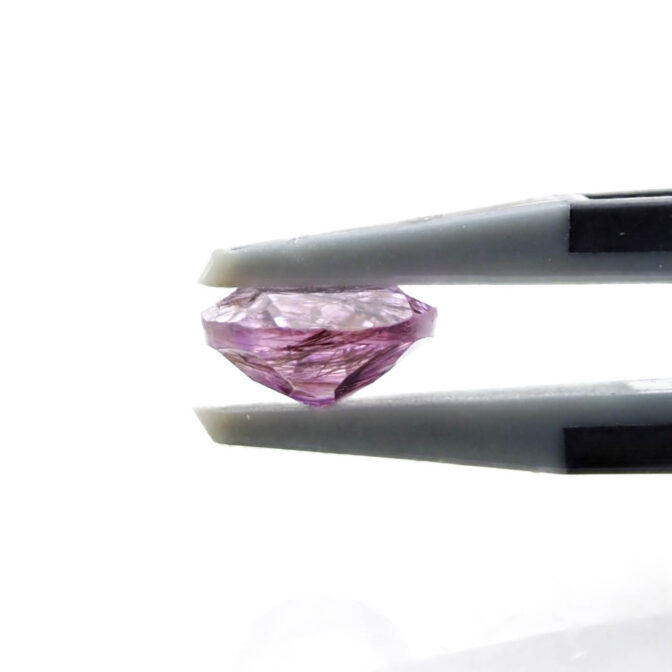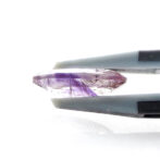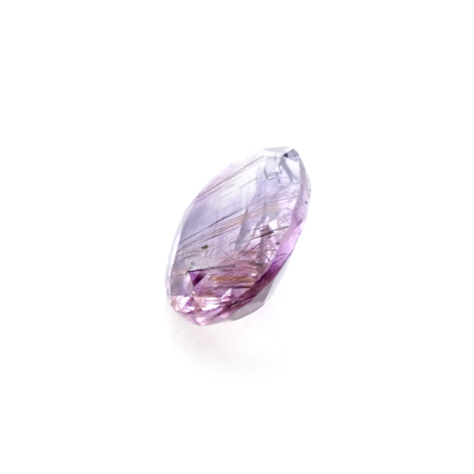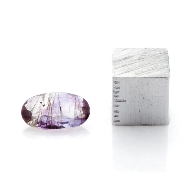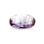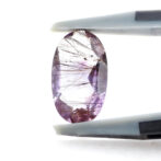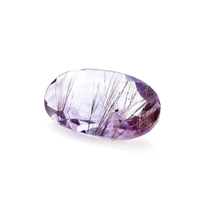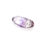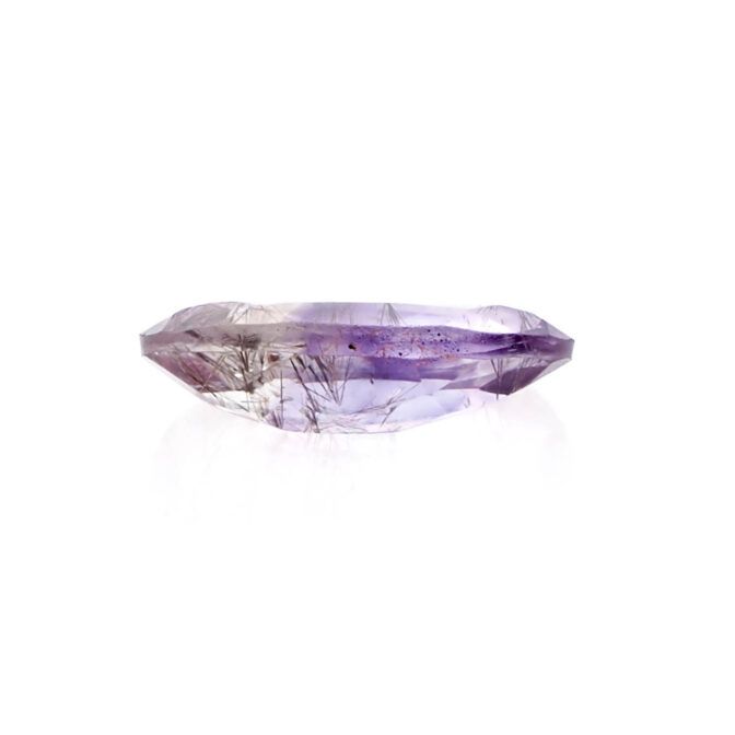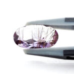 うっすら紫色のアメジストに黒と褐色の繊細なゲーサイトが散りばめられ、華やかな美しさ。端の方にクリアなクォーツが共生しているのもポイントです。全体的に透明度が高く、しっかりと綺麗なラウンドブリリアントカットに研磨され、宝石として圧倒的な存在感を放ちます。