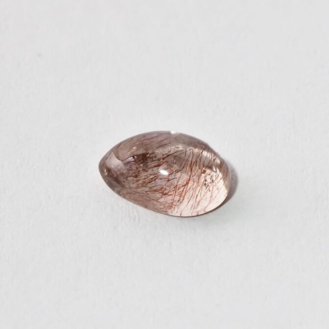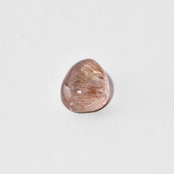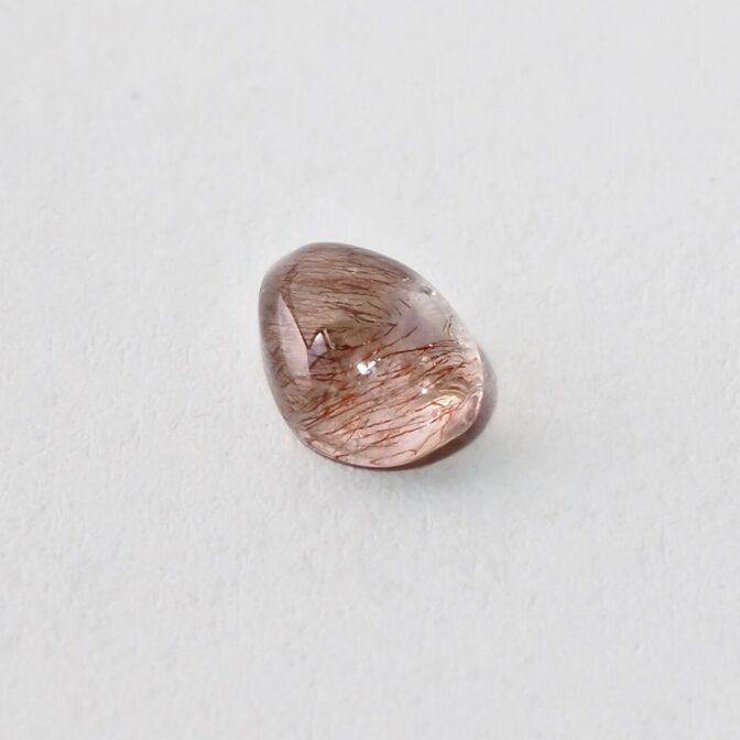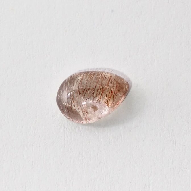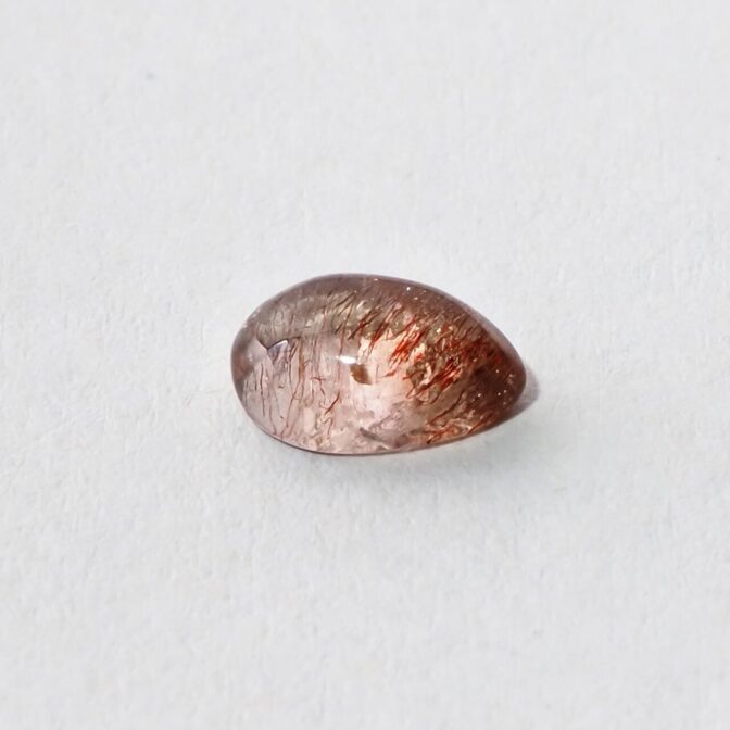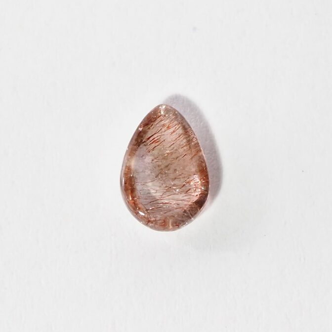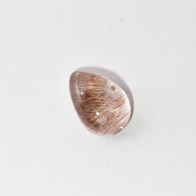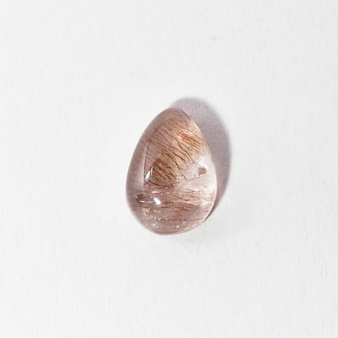 真っ赤な針状のインクルージョンは繊細かつ大胆。可愛らしくふっくらとしたドロップシェイプにカットされたクォーツの中でキラキラと輝きます。