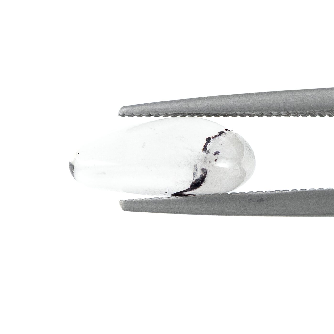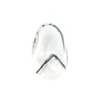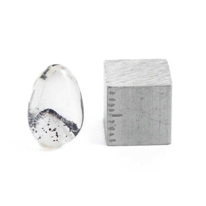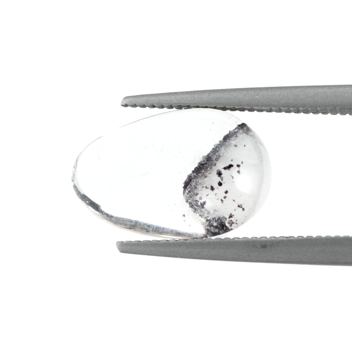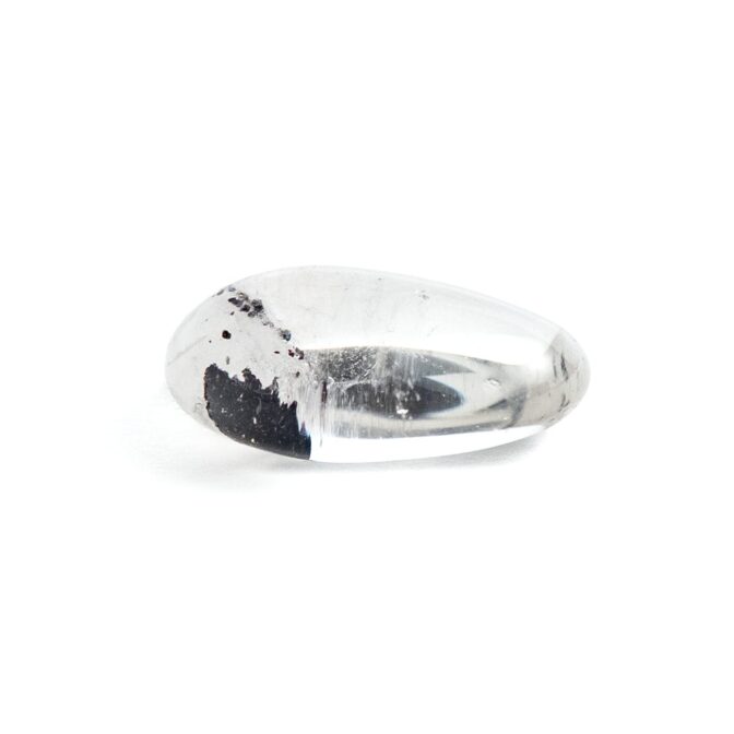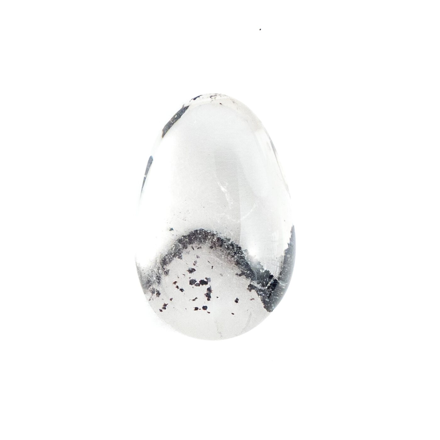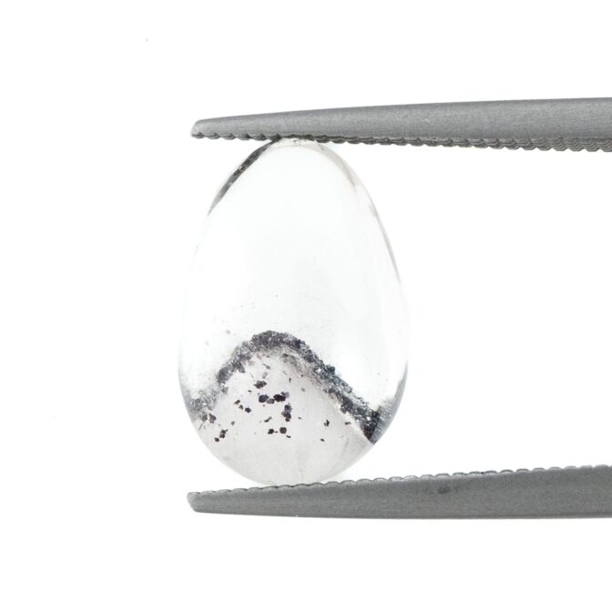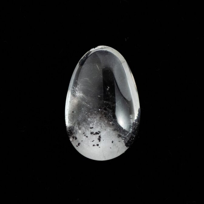 ただただ透明で清らかな輝きをもつクォーツは、それだけでも美しいのですが、インクルージョンによって見え方が劇的に変化するドラマティックな性質を持っています。このヘマタイトインクォーツは、水晶の透徹した魅力とふんわりと漂う霞のようなファントム、そしてファントムの柔らかい白とは対照的なヘマタイトのブラックが見事な調和を描きます。まるで、冬山の稜線のようにも見える美しい形と色合いは、丁寧な研磨とクリエイティブな石取りがあってこそ。大地が生み出した鉱物に、人の手が加わって初めて完成される芸術とも言えるでしょう。素朴な水晶の塊に美を見出す人の心と技術が作り出す宝石と言えるかもしれません。