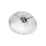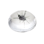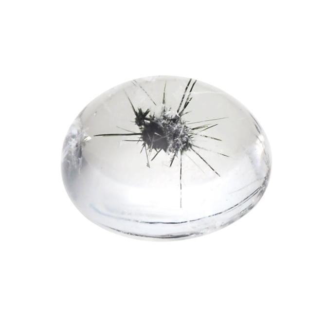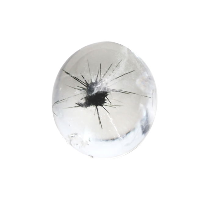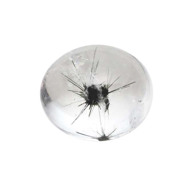 ウニ入り水晶!?いえいえ、その黒くてトゲトゲインクルージョンの正体はホーランダイト。通常は塊状で産出しますが、クォーツの中で針状の結晶として成長する不思議な鉱物です。水をたたえたようなつるんと丸いクォーツの中に堂々と収まるその姿は微笑ましくも個性的な迫力です。