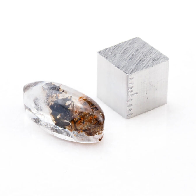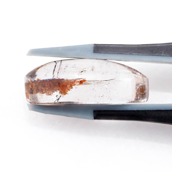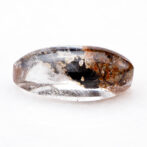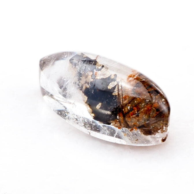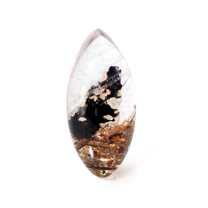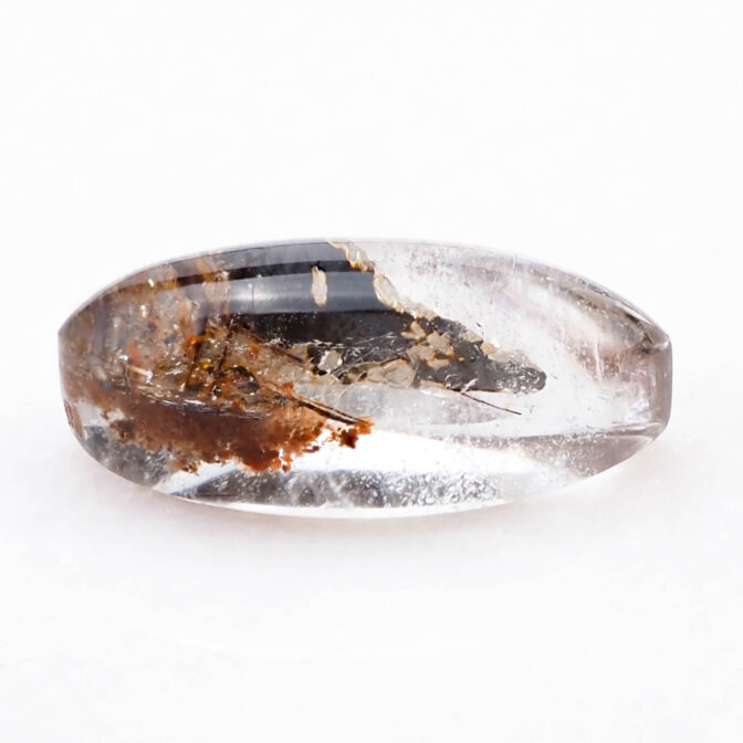 透明度が高いクォーツの中に、デザイン性豊かに入り込んだインクルージョンが織りなす不思議な空間。偶然の作用でクォーツの中に結晶したさまざまな要素を、芸術の域まで高める石取りの見事な一点もののルースです。