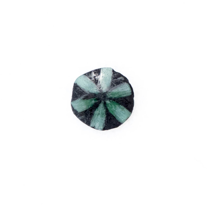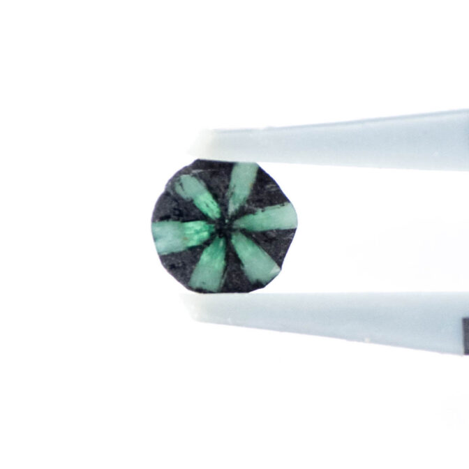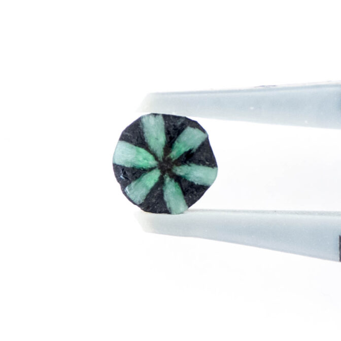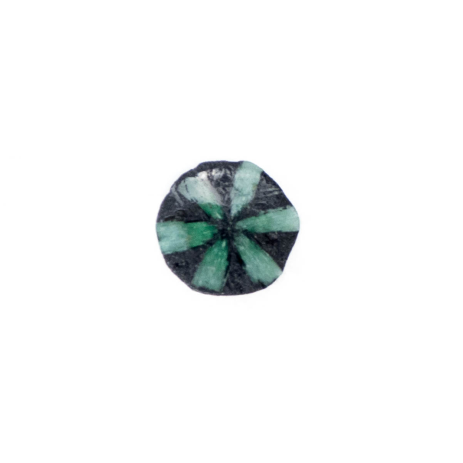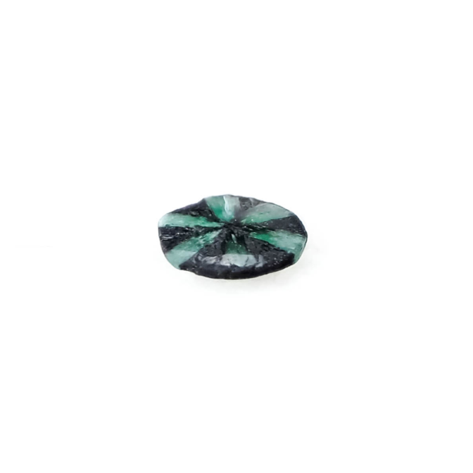 明るく華やかなエメラルドグリーンと黒い母岩のコントラストがとてもクールで、可愛らしさと落ち着きを兼ね備えた風情が感じられます。通常、トラピッチェエメラルドは形が歪んでいることが多いですが、こちらのルースは均整の取れた美しい形状をしています。