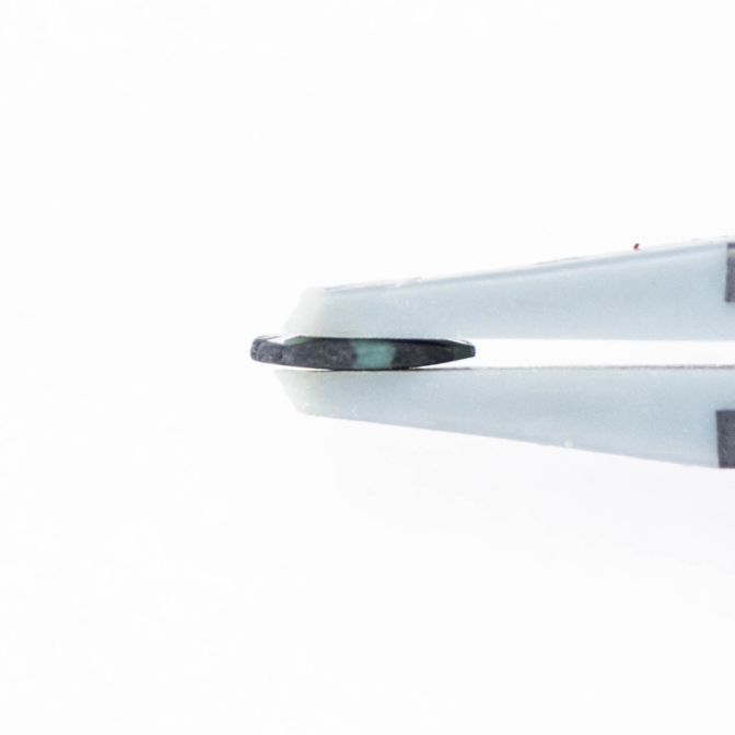 柔らかいトーンのエメラルドの中にバランス良く配置された黒い部分は、丁寧な研磨と相まって石の端正さを引き立てています。裏返しても、美しい表面と同様に楽しめるため、フクリン留めのネックレスにすると両面から石の個性を最大限に引き出すことができます。