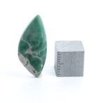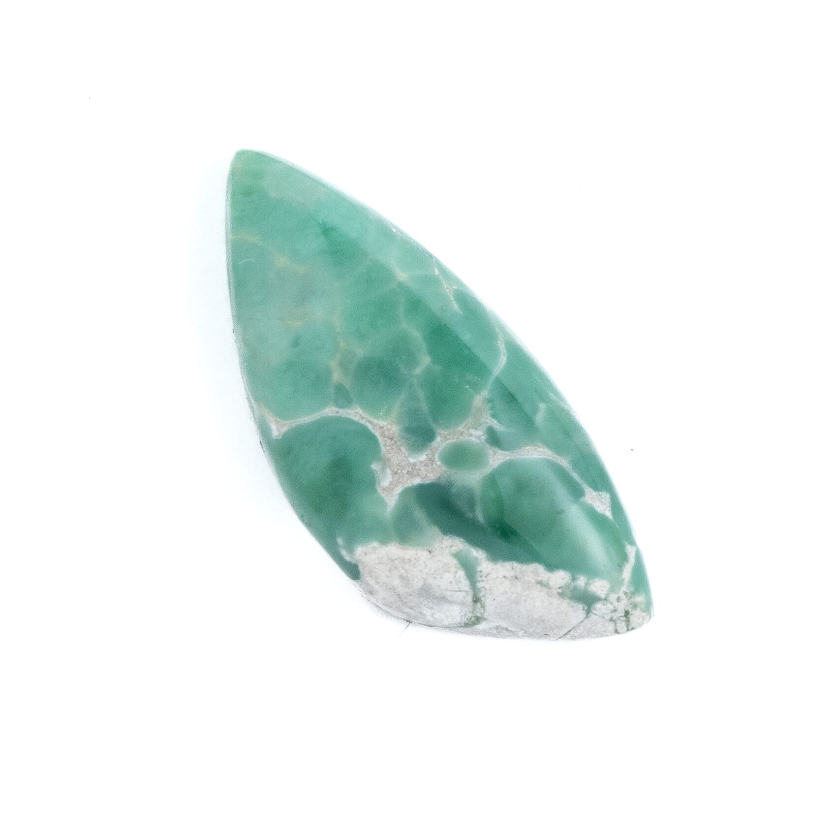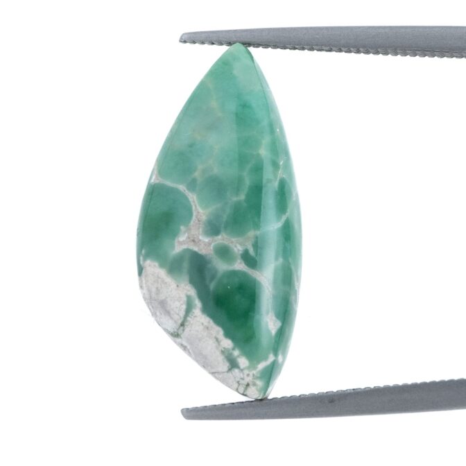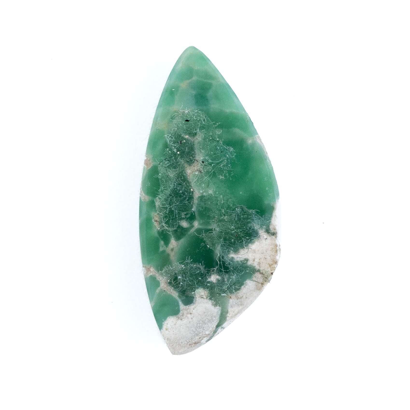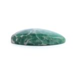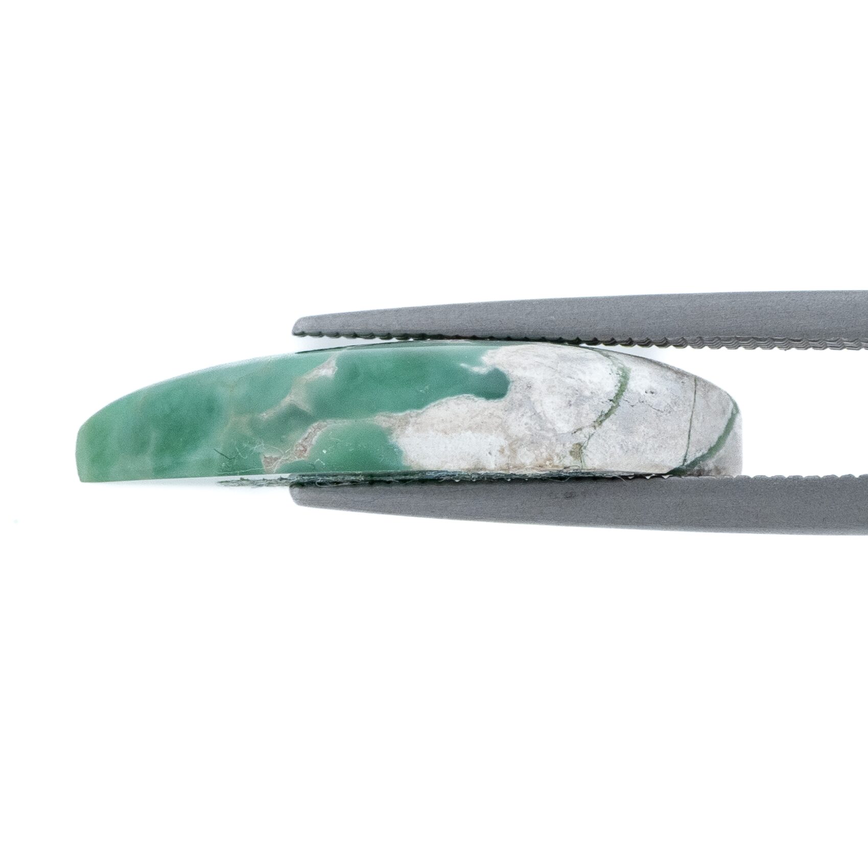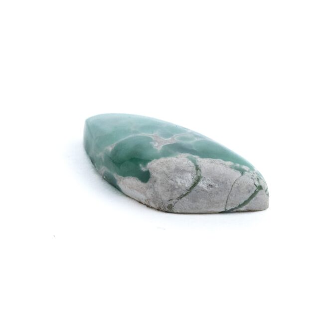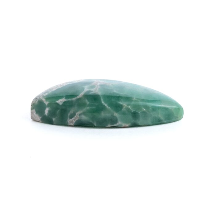 それにしても、グレイッシュなホワイトの母岩と鮮やかなグリーンの対比がお洒落ですね。2種類のカラーが作り出す複雑な模様に、時間を忘れてしばし見入ってしまいます。グリーンの部分だけ取り出すのではなく、あえて母岩も加えてアートピースのように研磨しているセンスが見事。ドラマチックかつ個性的な美しさはエレガントさすら感じます。