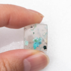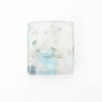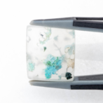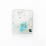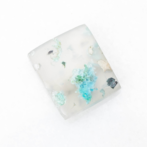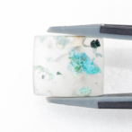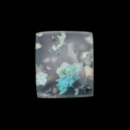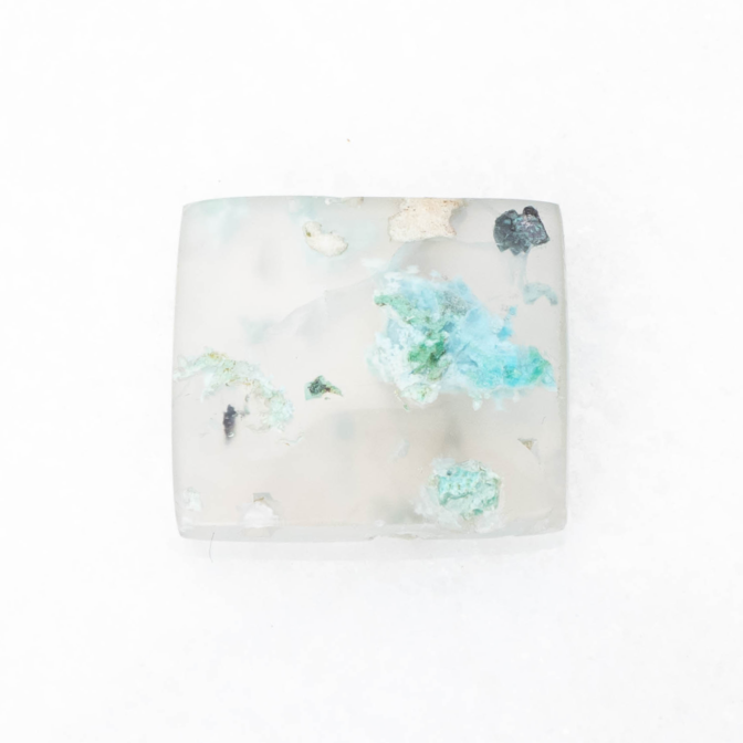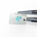 透明な珊瑚礁の海を上からのぞいた様な、不思議なインクルージョンを絵画の様な四角いキャンバスに閉じ込めたような風情。パッと目を引く鮮やかなブルーの大きなクリソコラの結晶は、まるでパライバトルマリンの様なネオン感溢れる色。その中心にうっすらとマラカイトのグリーンを抱えています。思わず、「君はどうしてこんなふうに生まれてきたのかしら?」と石に向かってつぶやいてしまうほど個性を持っているルースです。