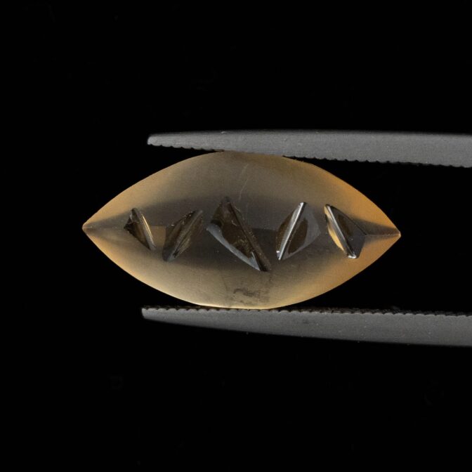 中央に仕掛けられた謎の「彫り込み」が、光のトリックを完成させます。石の内側をくり抜いたような、あるいは裏側から繊細な段差を刻んだような、独自の彫刻的アプローチ。計算し尽くされたその溝が、石の中で光を複雑に反射させ、まるで黄金の稲妻や、伝説の生き物の鱗が浮かび上がっているかのような、ドラマチックな視覚効果を生み出しているのです。