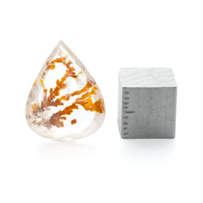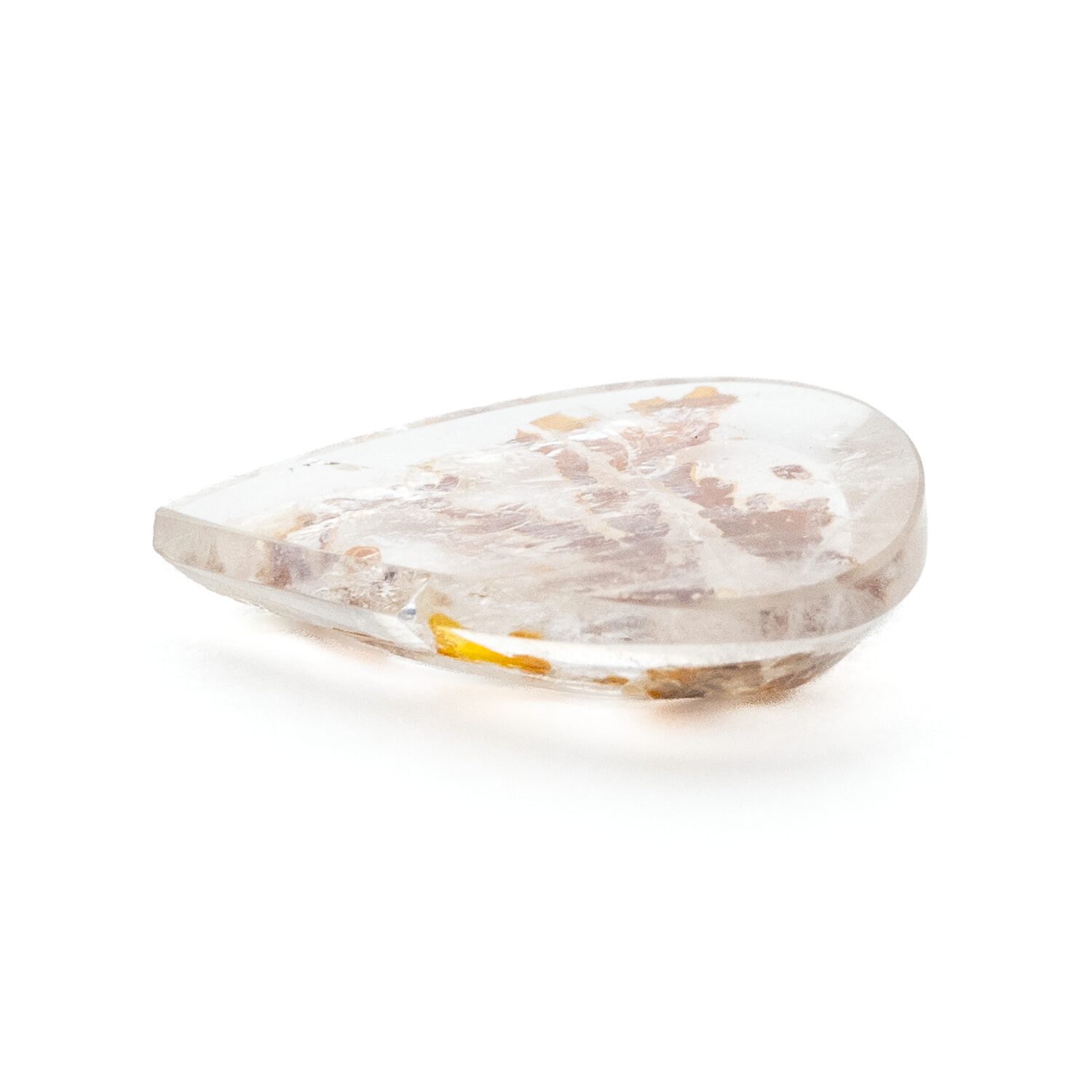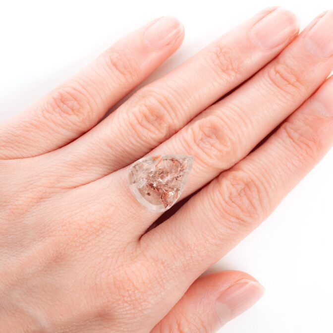 向こう側の景色をふんわりと透かす透明なクォーツの中で、生命力あふれるインクルージョンがいきいきと輝いています。柔らかい曲線で構成されたシェイプが、クォーツの持つ鋭い印象を和らげ、少し「抜け感」のある可愛さを添えて。