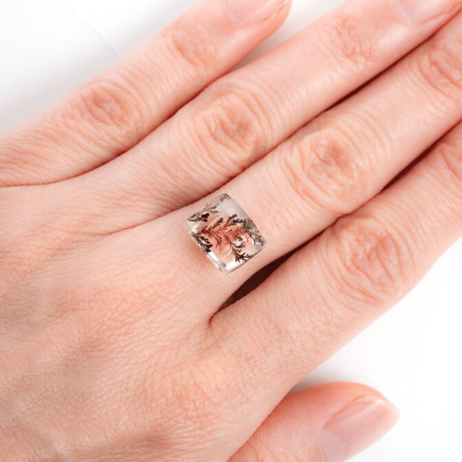 向こう側の景色をふんわりと透かす透明なクォーツの中で、生命力あふれるインクルージョンがいきいきと輝いています。柔らかい曲線で構成されたシェイプが、クォーツの持つ鋭い印象を和らげ、少し「抜け感」のある可愛さを添えて。