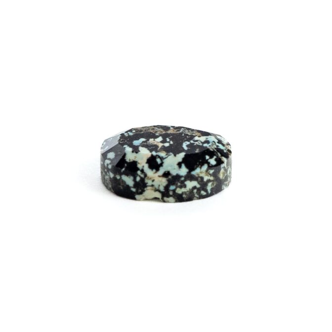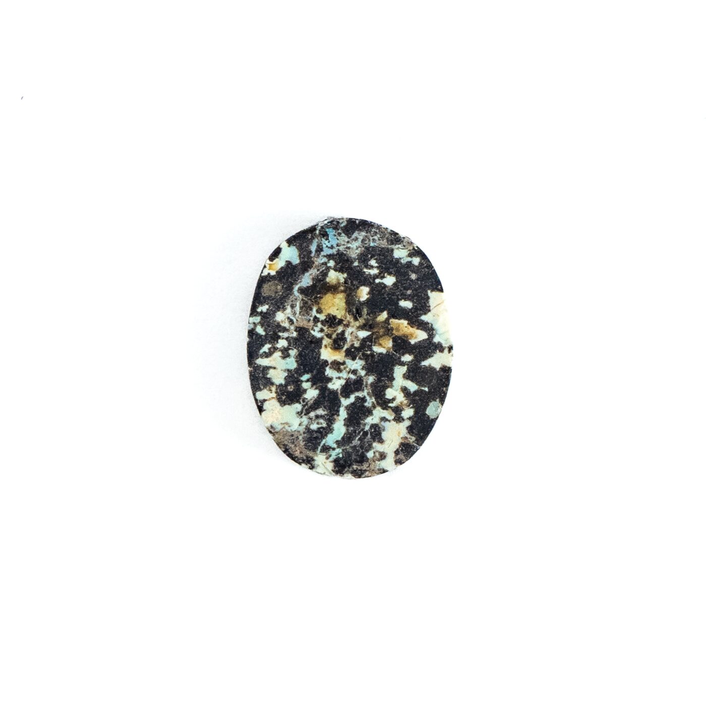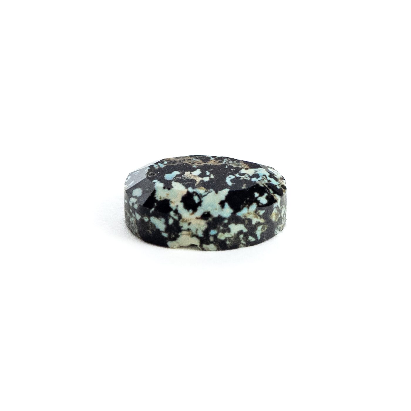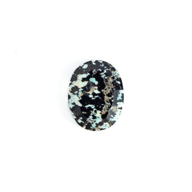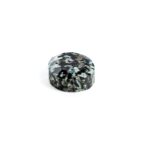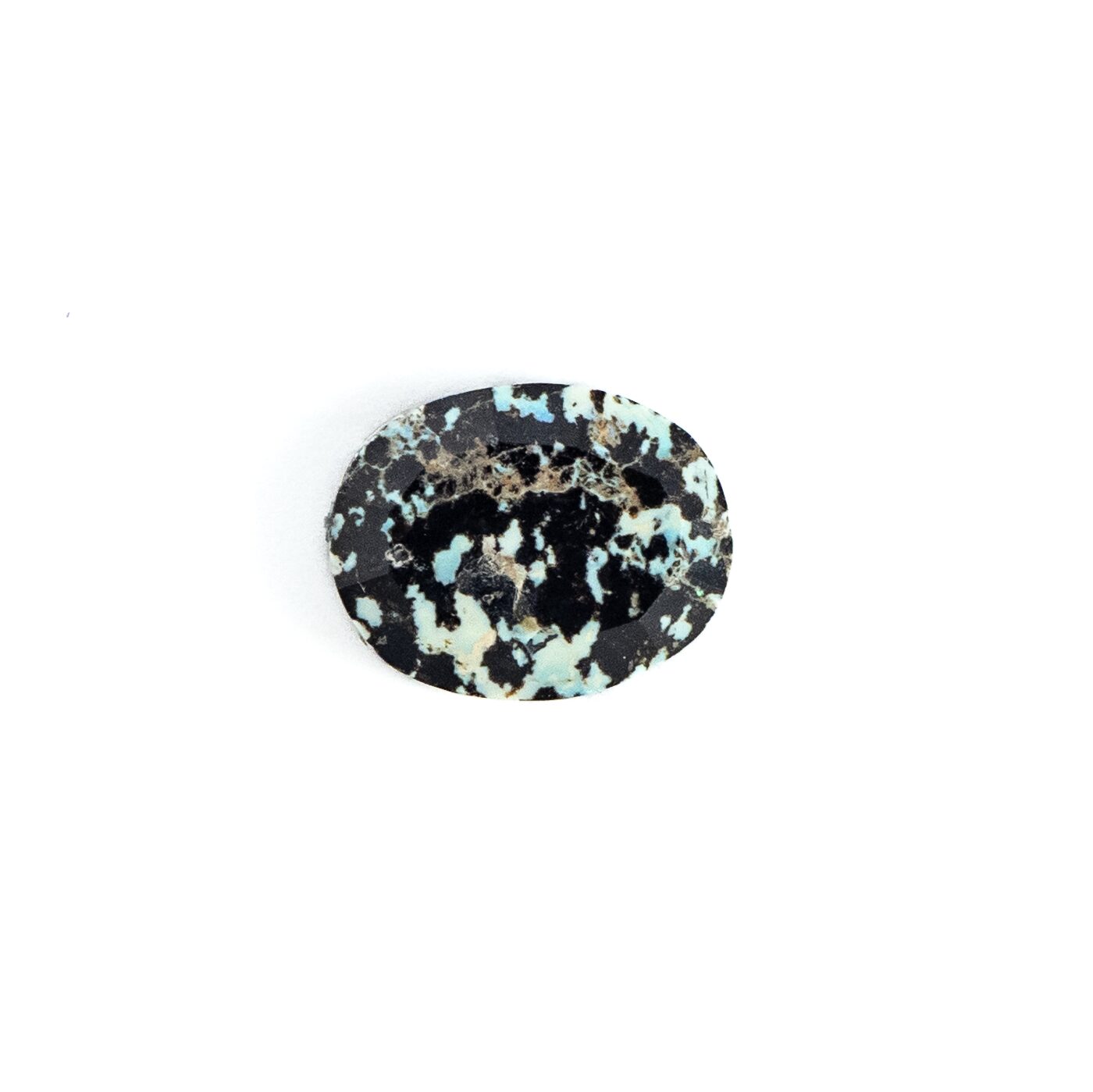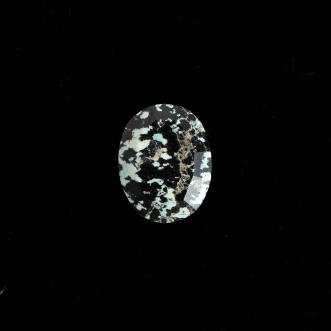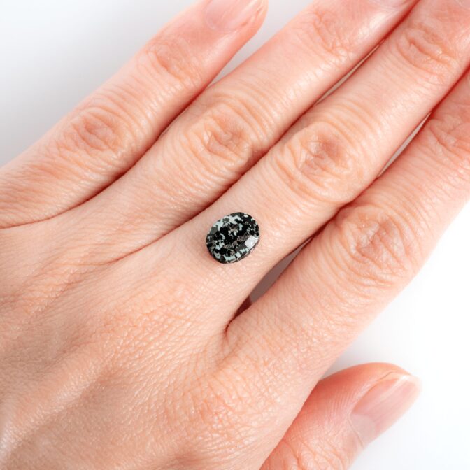 <チャームポイント>: 自然界が生み出した漆黒と白のコントラスト。火山岩の中にオパールが入り込むという不思議な生い立ちが、まるで豹の斑紋のような意匠を描き出しました。