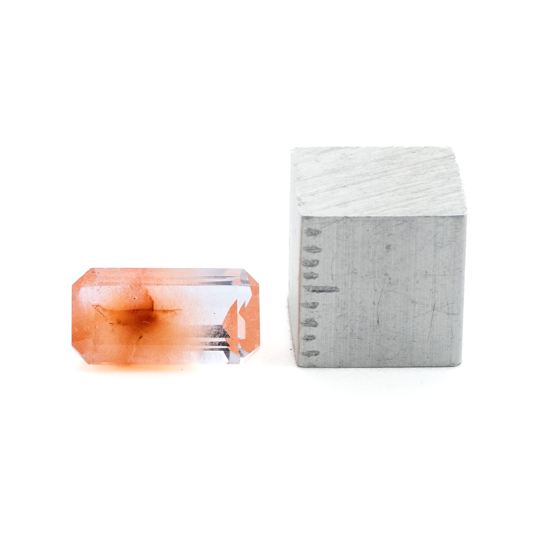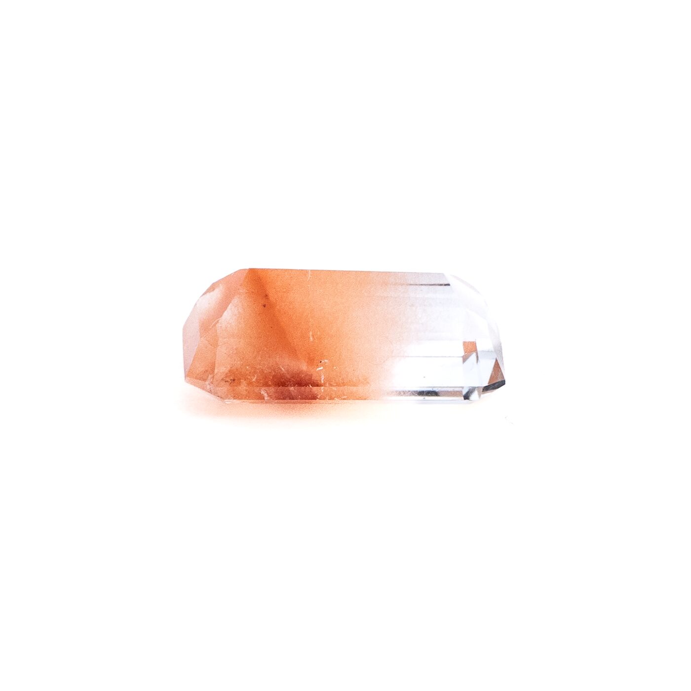 <特徴>: ごろっとしたカボションという「王道」に背を向け、端正なエメラルドカットという「よそ行きのおしゃれ着」を纏った異端児。水晶の奥行きを味方につけた、立体的な「大人ピンク」の階調が自慢。