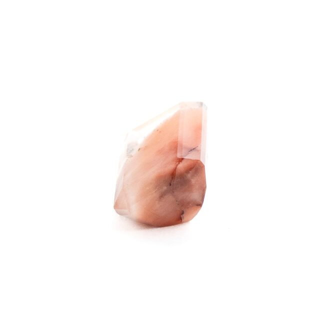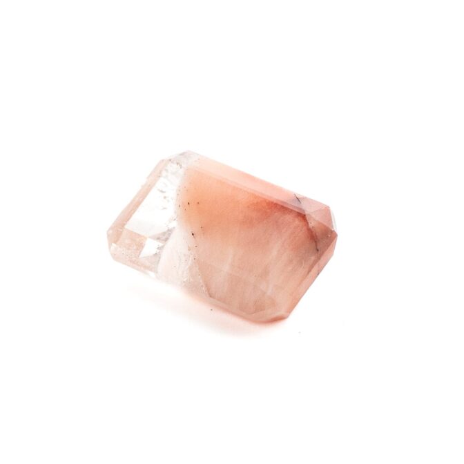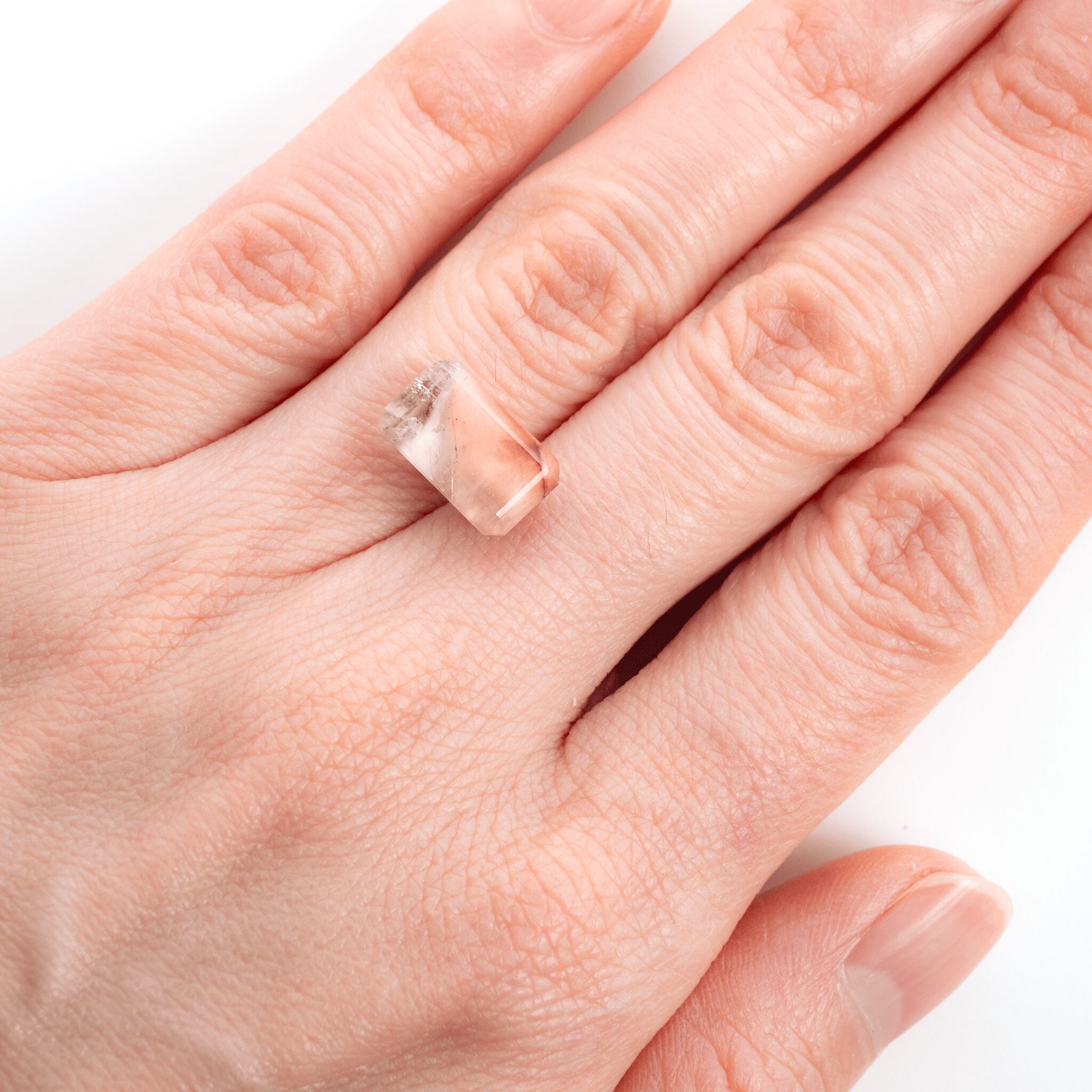 <特徴>: ごろっとしたカボションという「王道」に背を向け、端正なエメラルドカットという「よそ行きのおしゃれ着」を纏った異端児。水晶の奥行きを味方につけた、立体的な「大人ピンク」の階調が自慢。