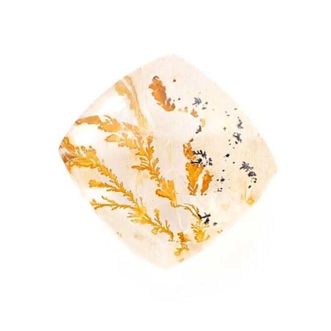デンドリティッククォーツの中でもイエローやレッド系のカラーを持つものはとても希少。コントラストが強く、インパクトがある強い色で構成されていますが、ルース自体が小ぶりで細やかな模様のため、圧倒的な存在感というよりも、人を和ませるような味わいがあります。何やら楽しげにクォーツの中に居座っているインクルーージョンの姿を見ると、「置かれた場所で咲く」とはこういうことかと妙に納得してしまいます。ルーペで観察すると細かな粒子が膜上に広がって模様を形成しているのが見てとれ、間違いなく天然の産物であることがわかります。加工の跡などもちろんありません。