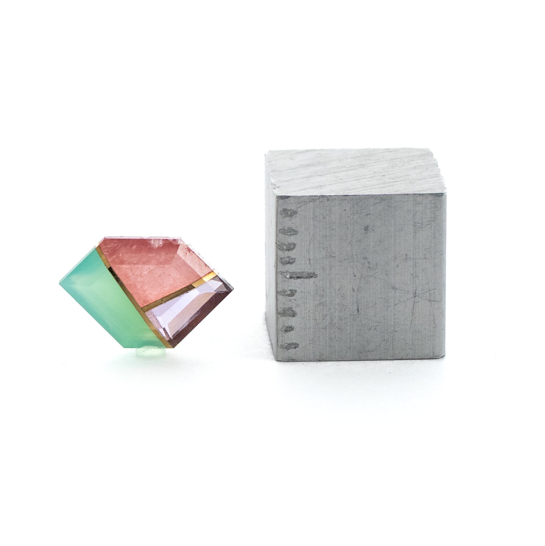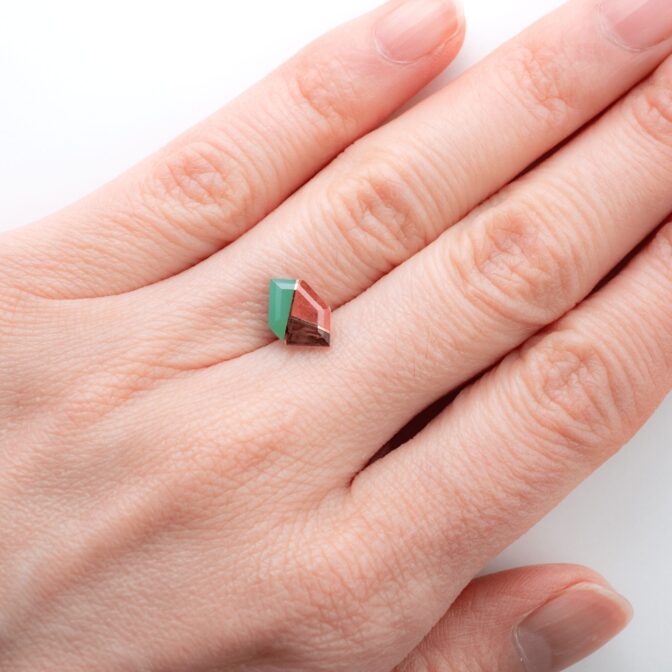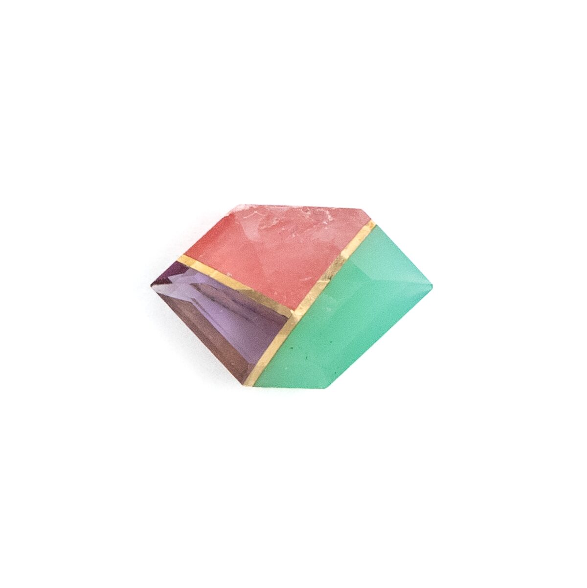 まず、整ったファセットカットの奥を覗いてみてください。一見すると、幾何学模様の迷宮に迷い込んだような楽しさ!クリソプレーズ、ロードクロサイト、アメジスト。春の庭園を思わせる石たちが、まるでモザイクのように精密に組み合わされ、その境界には本物の18金が、裏側まで贅沢に、かつ軽やかに施されています。段差を一切感じさせないこの見事な仕上がり。熟練の職人さんが、この石のためにどれだけ心を込めて手仕事をしたのか、眺めているだけでこちらまで背筋が伸び、そしてワクワクしてしまいます。