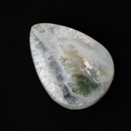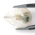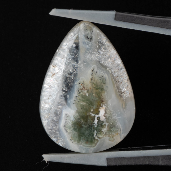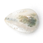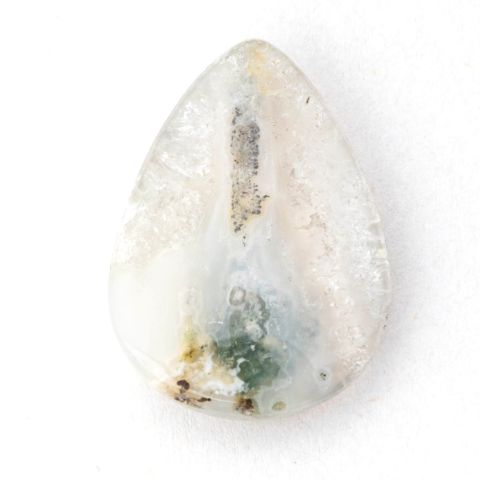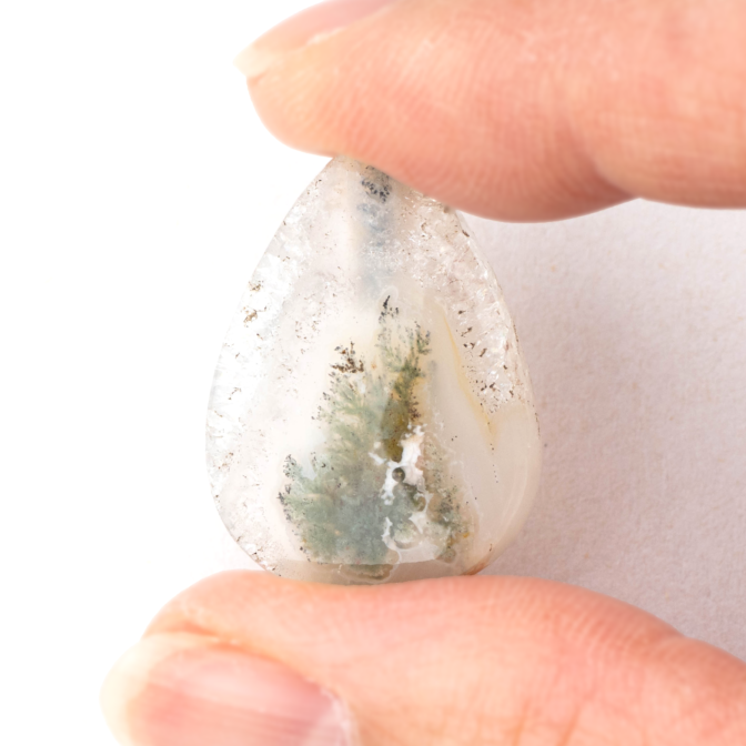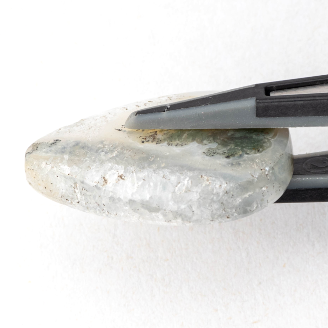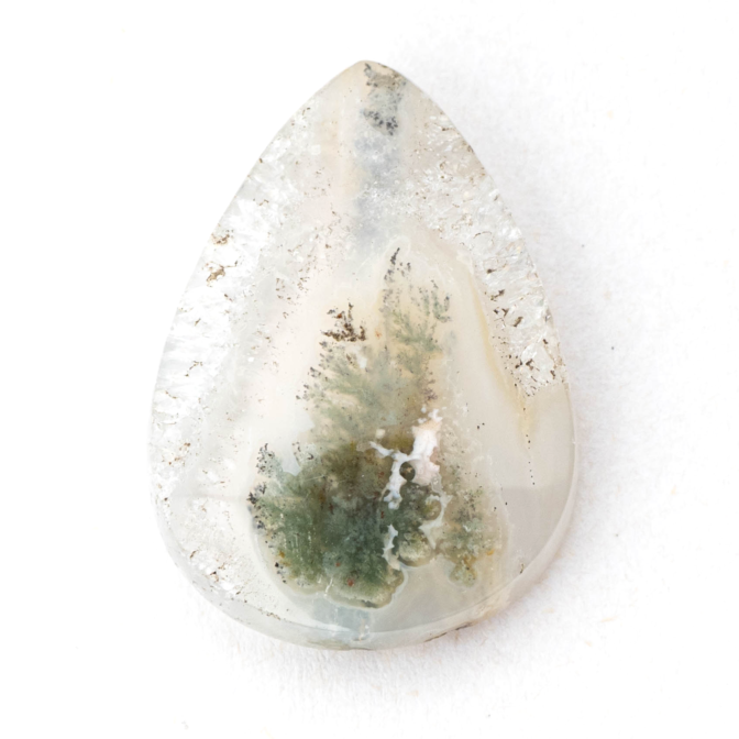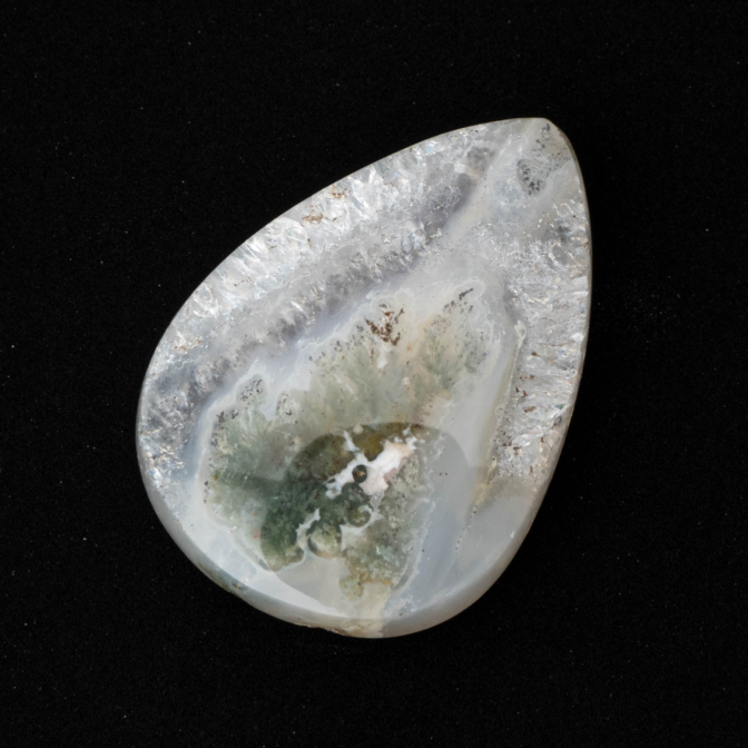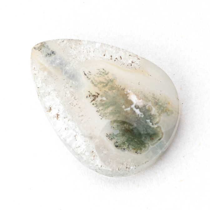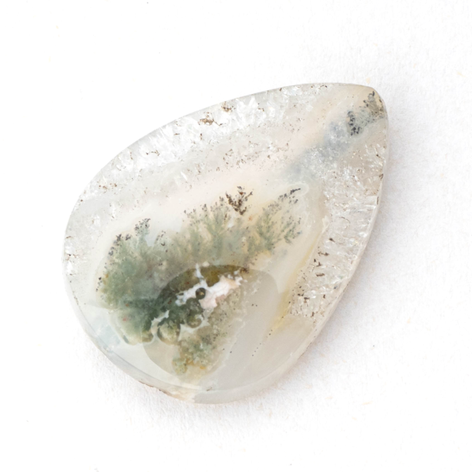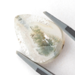 苔むした風情が侘び寂びの趣を感じさせるモスアゲート。乳白色で半透明のアゲートに角閃石のモスグリーンが入り込み、本当の植物のように見える味わい深い石です。そう、モスアゲートといえば通常乳白色で半透明なのです。ところが、今回このページでご紹介しているモスアゲートは、ちょっと違います。非常に透明度の高いアゲートに、繊細なクラックと乳白色半透明の部分がふんわりと混じり合い、雪と氷に覆われた森を閉じ込めたような静謐な美しさをたたえています。